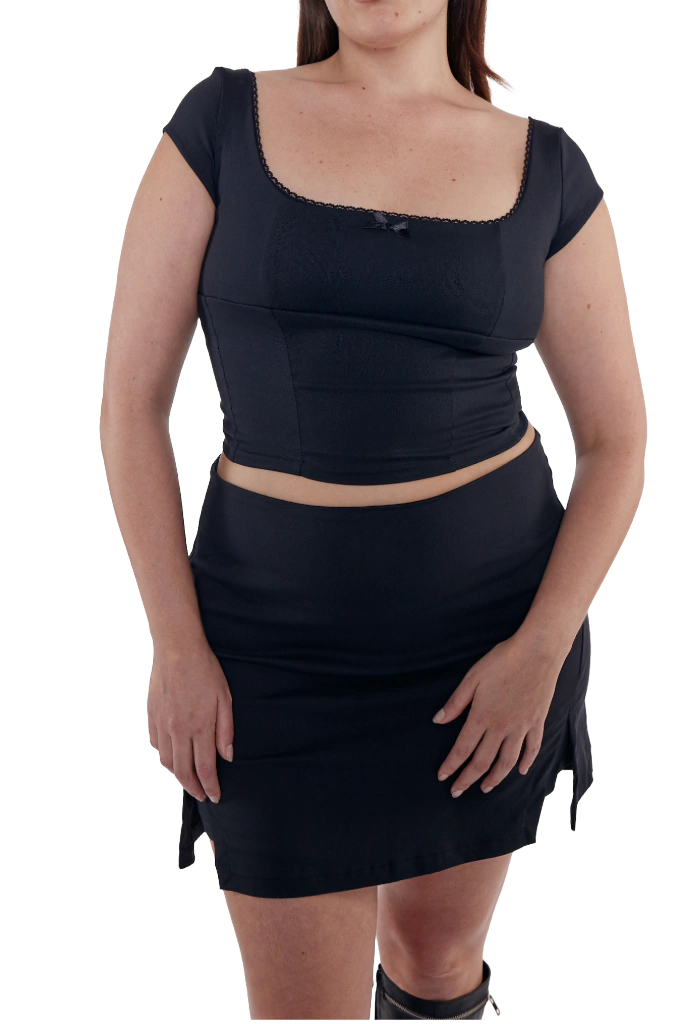 Top de bengalina tipo corset con recortes y escote cuadrado con puntilla.