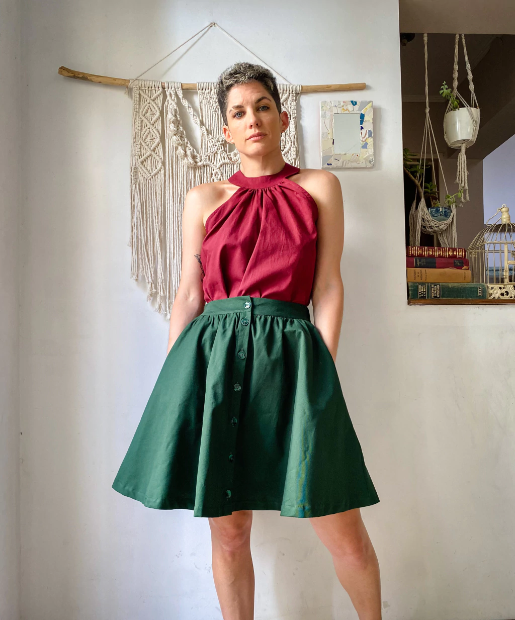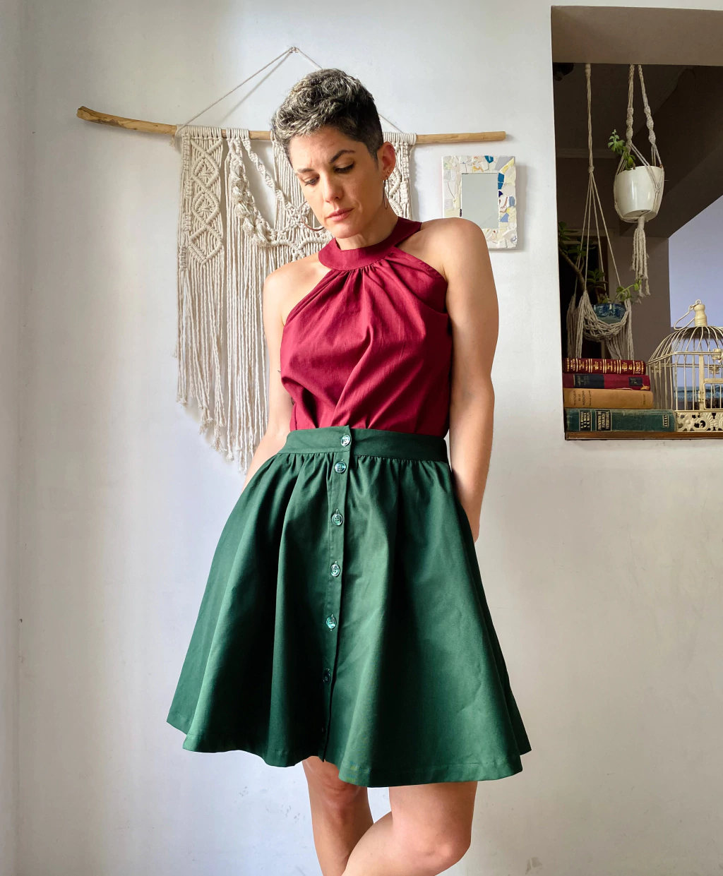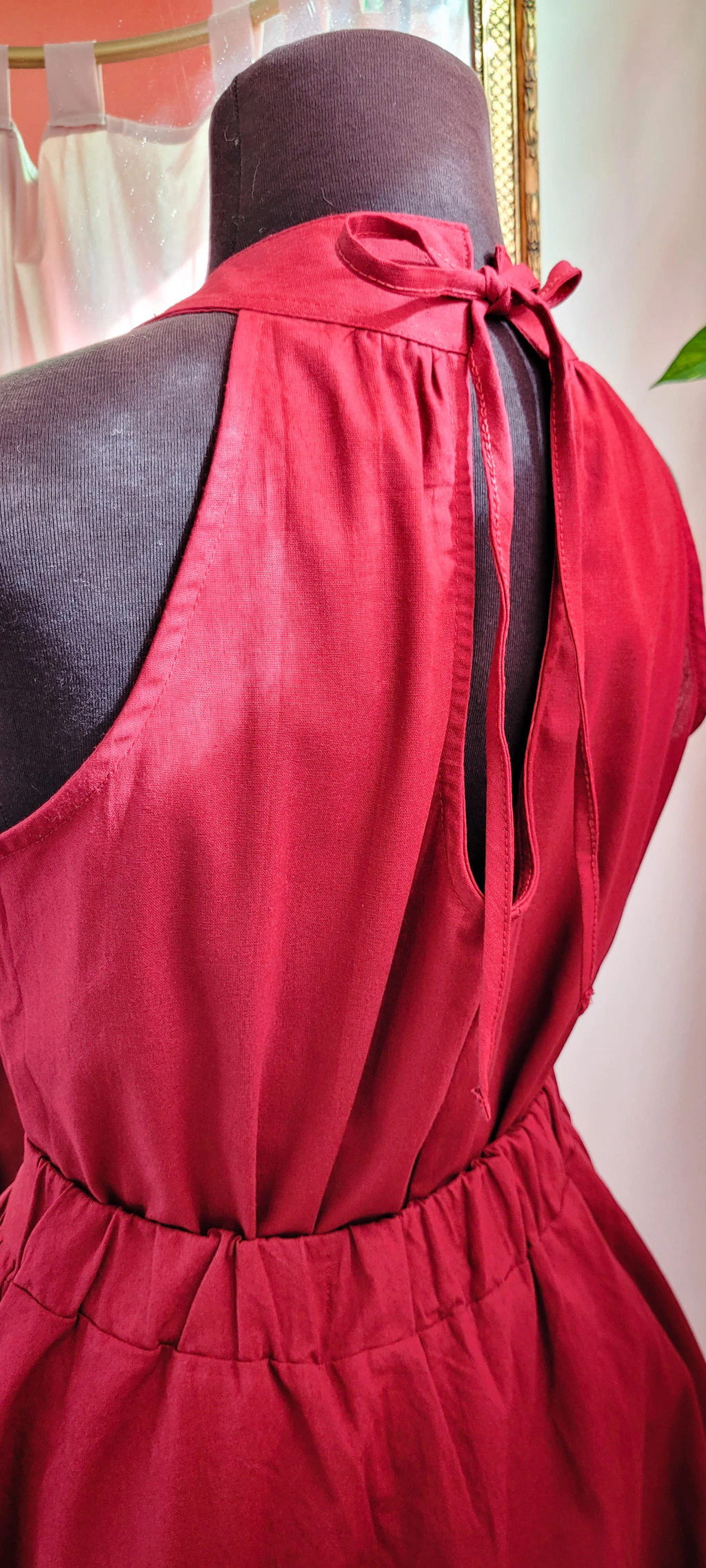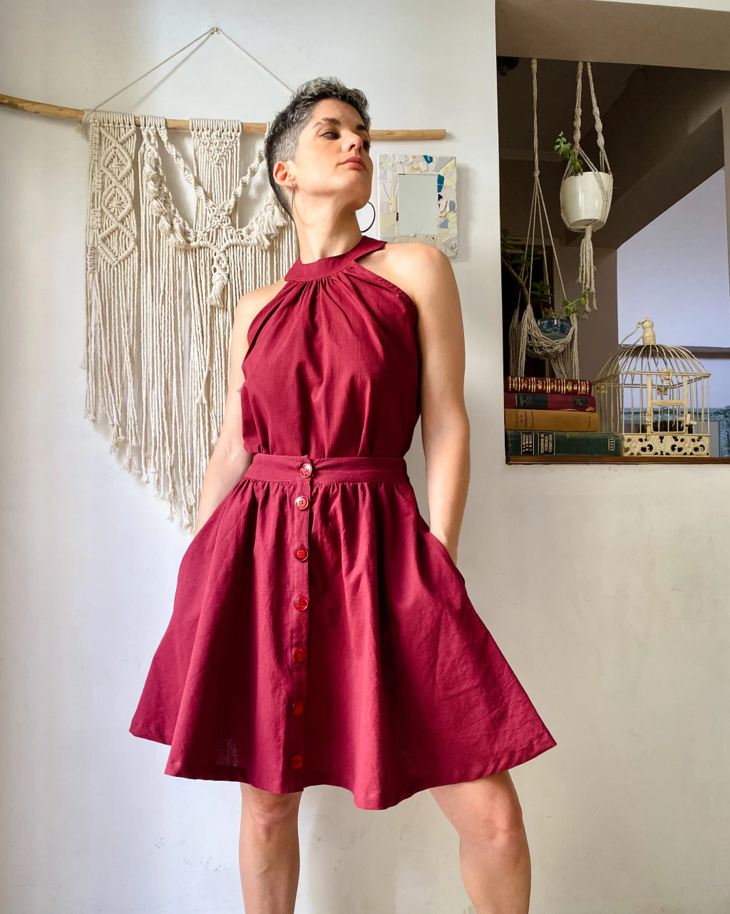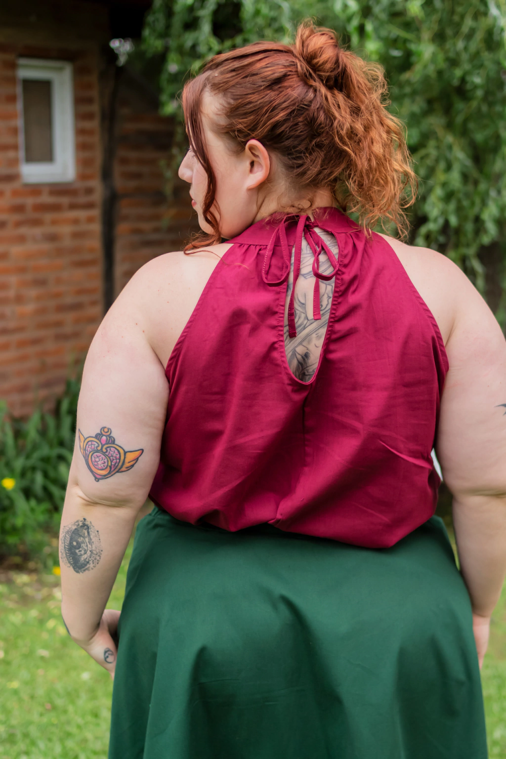 Blusa de tusor liso con silueta holgada y escote halter. El cuello se abre atrás y se ata con dos tiritas, generando una abertura con forma de gota en la espalda.El calce es super suelto y el largo es clásico: termina abajo de la cintura.El tusor es una tela pesada y resistente, compuesta 100% de algodón. Es fresca y maravillosa para los días de calor, ya que su tejido permite que el cuerpo respire y no transpire 😉