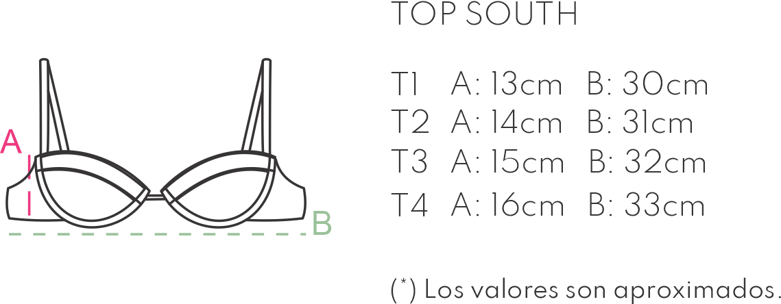 El top es un corpiño de corte bajo con aro, bretel regulable y broche mariposa en la espalda. Recomendamos un talle más de lo normal, es de tasa pequeña.