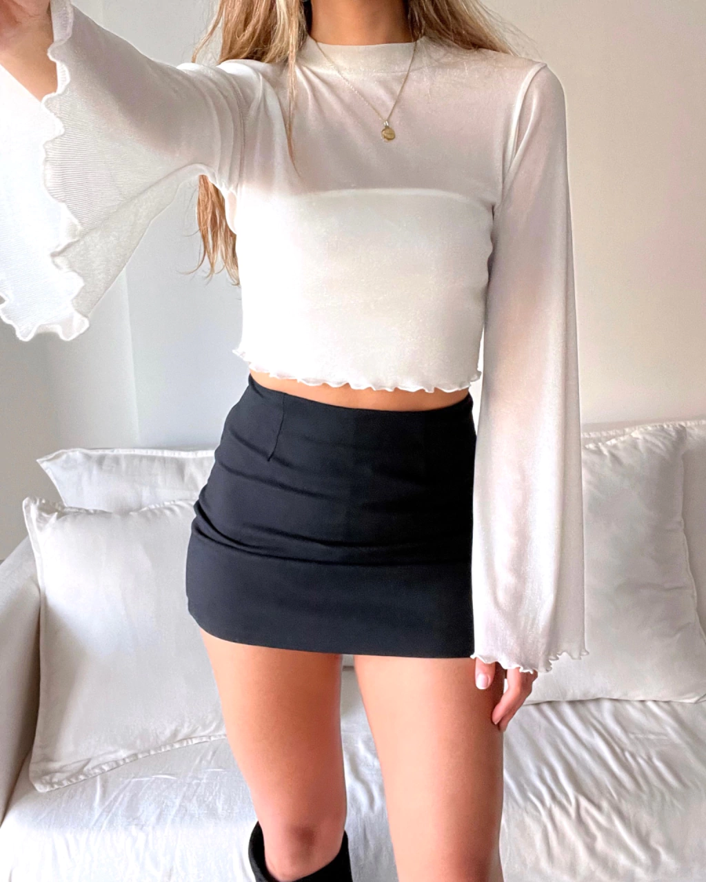 Top de microtul elastizado con brillitos y transparencia, con cuello media polera y mangas amplias. (No incluye el top de abajo)MEDIDAS:TALLE S/MTALLE M/LLargo (del hombro al ruedo)38 cm40 cmContorno de busto80 cm (cede hasta 105 cm)85 cm (cede hasta 115 cm)Largo de manga61 cm62 cm