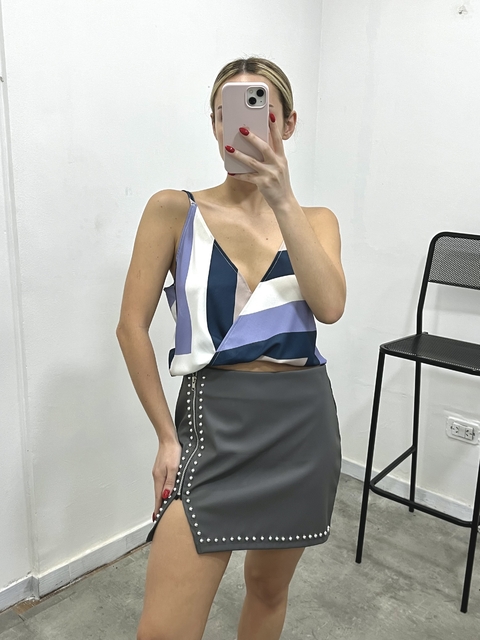 Top de tela sastrería con terminación en elástico y escote en v.