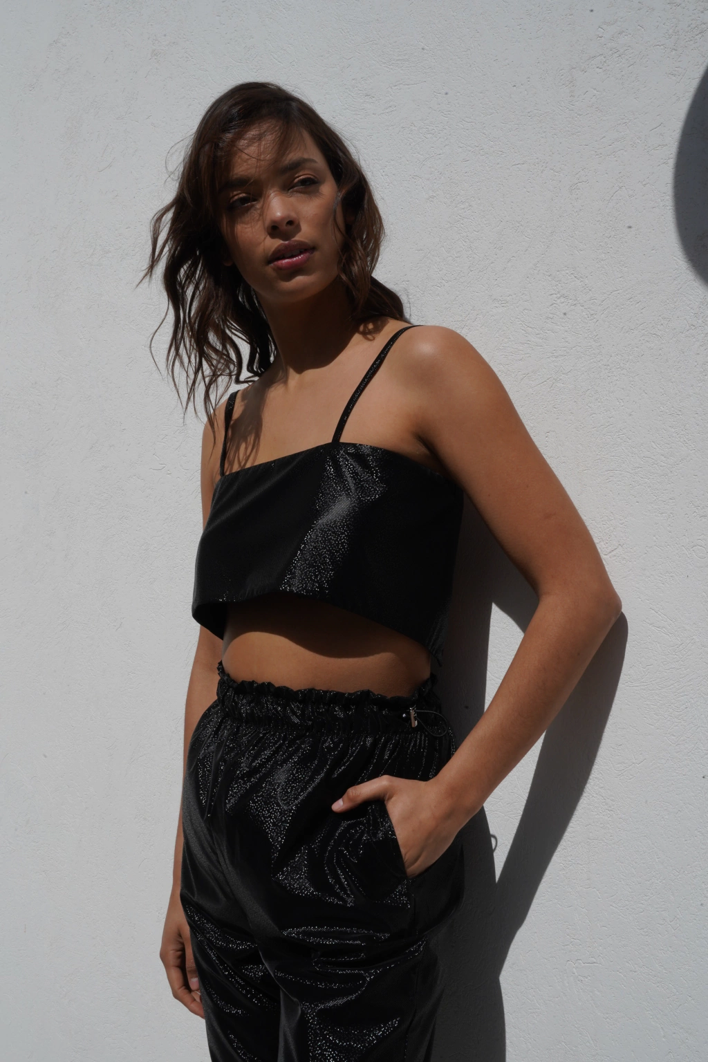 Top confeccionado en tela plana, con brillos, lleva breteles regulables y se ata en la espalda