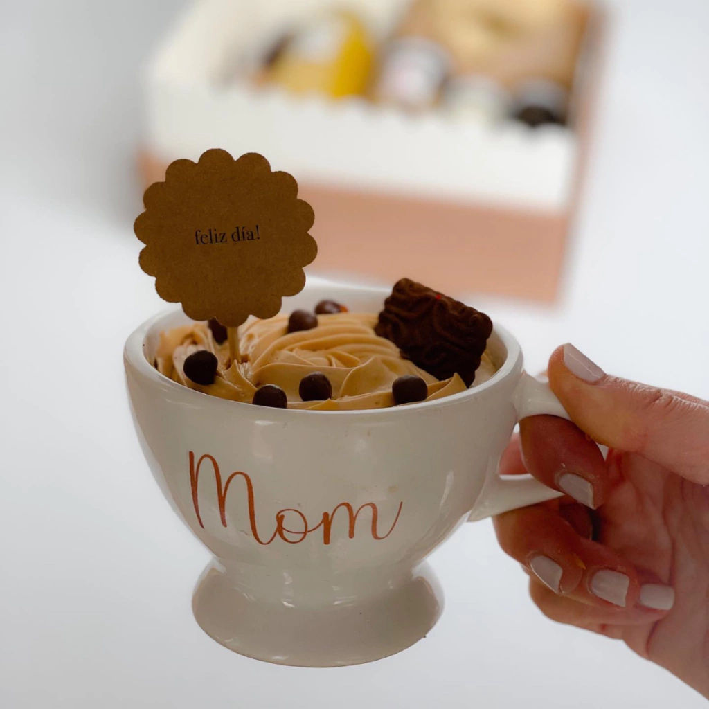 Tazón blanco estampado en color rose gold “MOM” con una torta deliciosa:•Brownie, dulce de leche, merengue y chocolates•Lemon pie•Chocotorta•Tiramisú•Kitkat*Vienen en un bellísima caja con topper y una cuchara