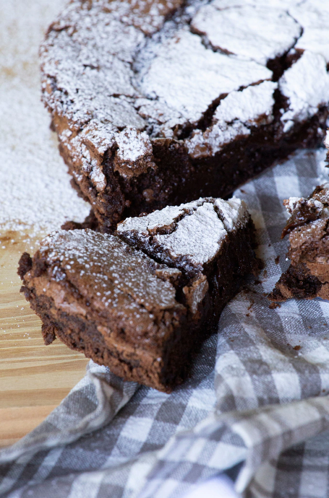 Torta de chocolate. Masa a base de manteca, azúcar y chocolate. Sin harinas, muy húmeda y recubierta con azúcar impalpable.