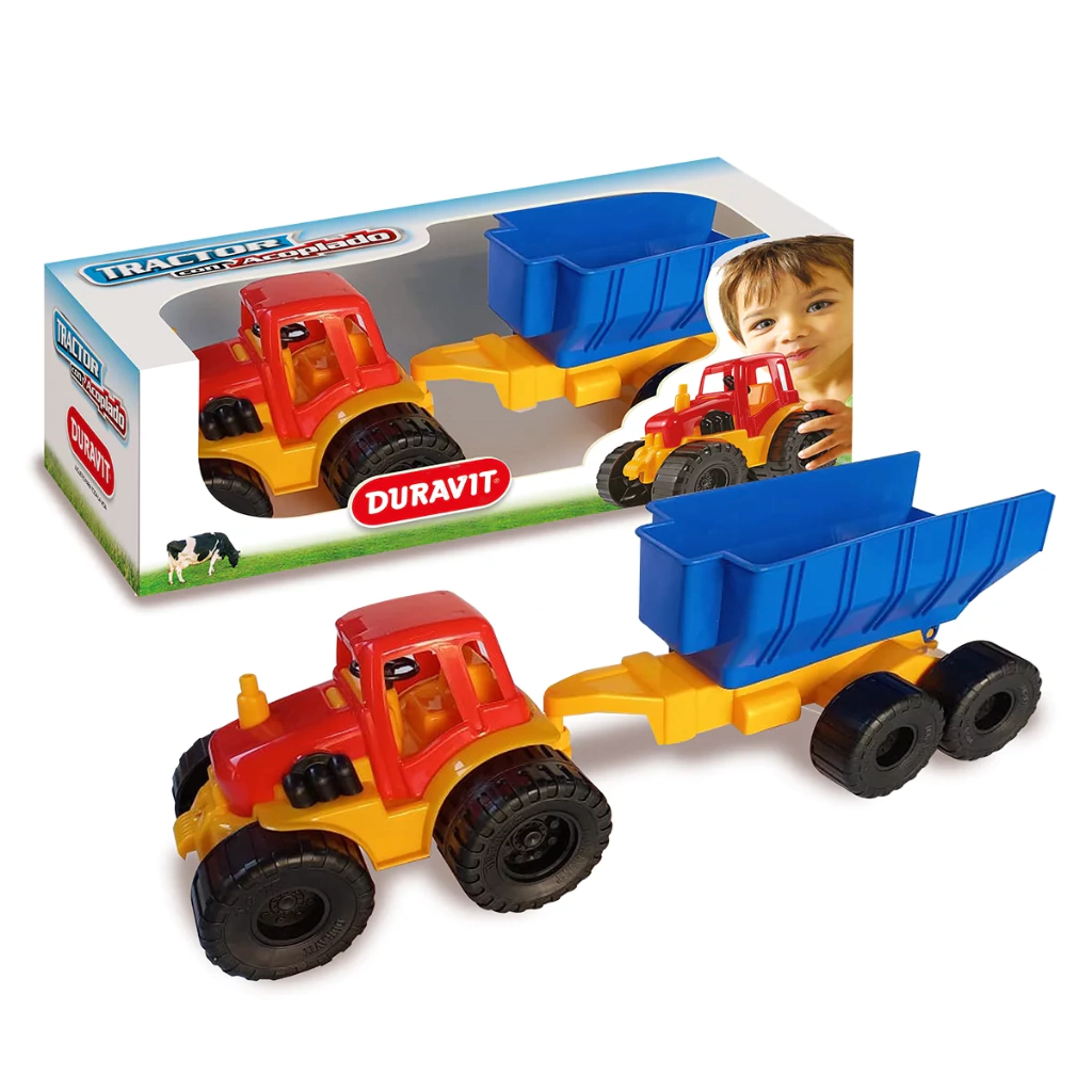 Tractor mediano con acoplado de colección DURAVITMedidas del camión:17Cm de alto x 23Cm de ancho x 53Cm de largo.Medidas de la Caja:23Cm de alto x 20Cm de ancho x 52Cm de largo.