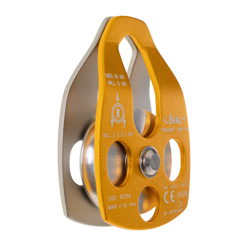 Polea simple de grandes dimensiones con placa móvil y de muy alto rendimiento gracias a su roldana montada sobre rodamientos de bolas.