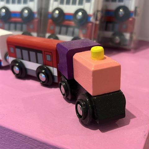 Trencito de madera con locomotora y 3 vagones.Los vagones se conctan entre sí por un poderoso imánMedidas armado: 29x4,5 cm.
