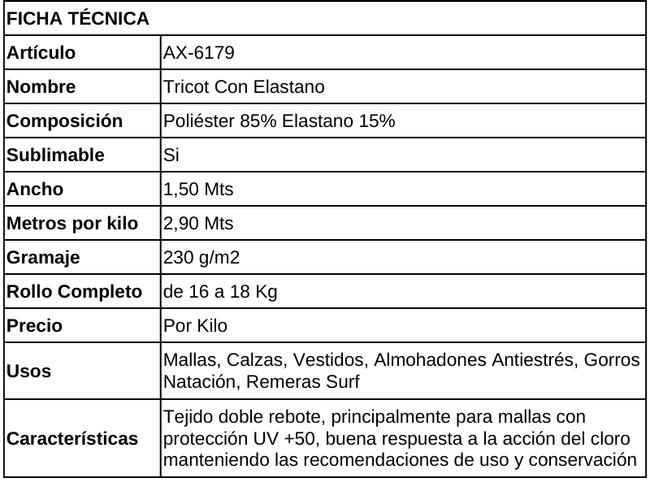 Composición: Poliéster 85% Elastano 15% Ancho: 1.50 Mts. Rinde x Kg: 2.90 Mts.