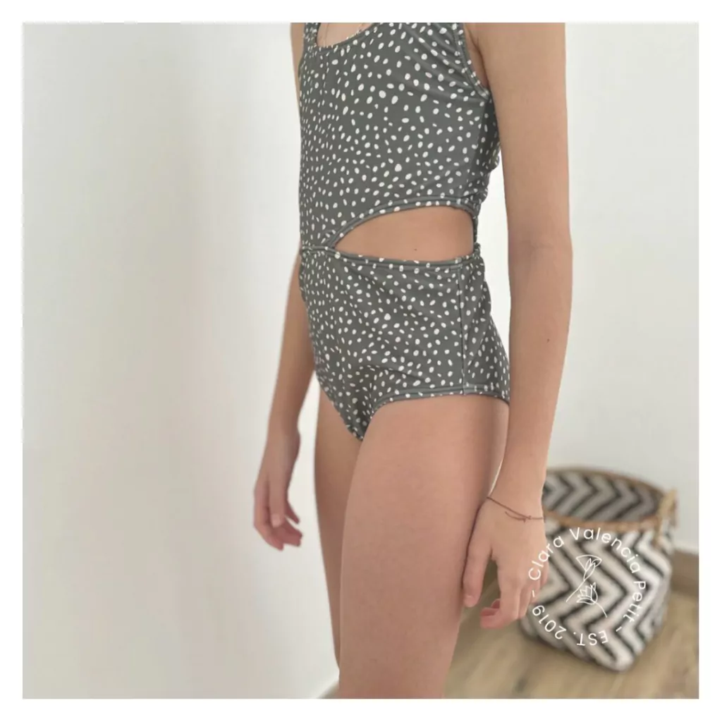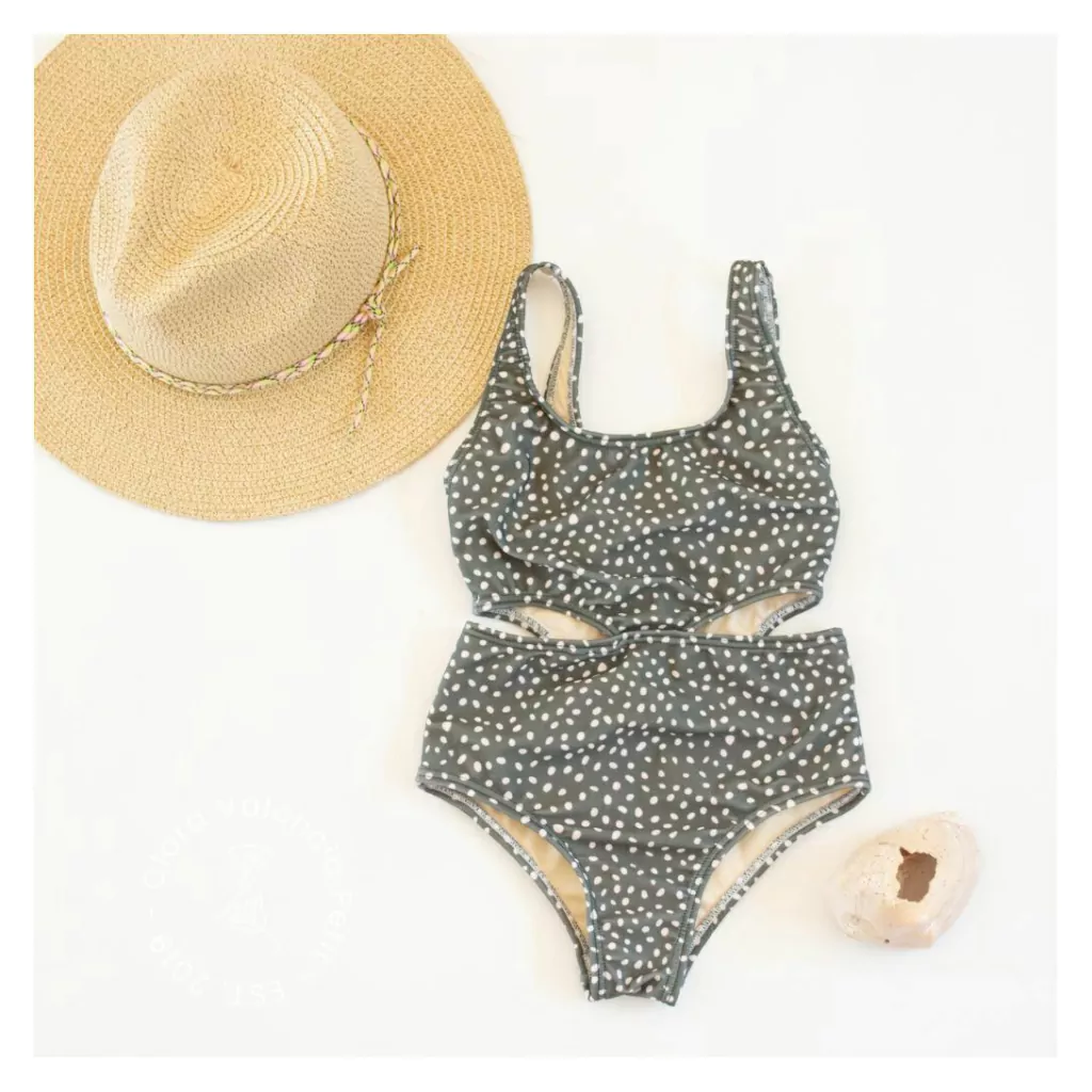 Traje de baño entero tipo trikini, con recortes en los costados. Confeccionado en Lycra Premium con protección UV, enteramente forrada.