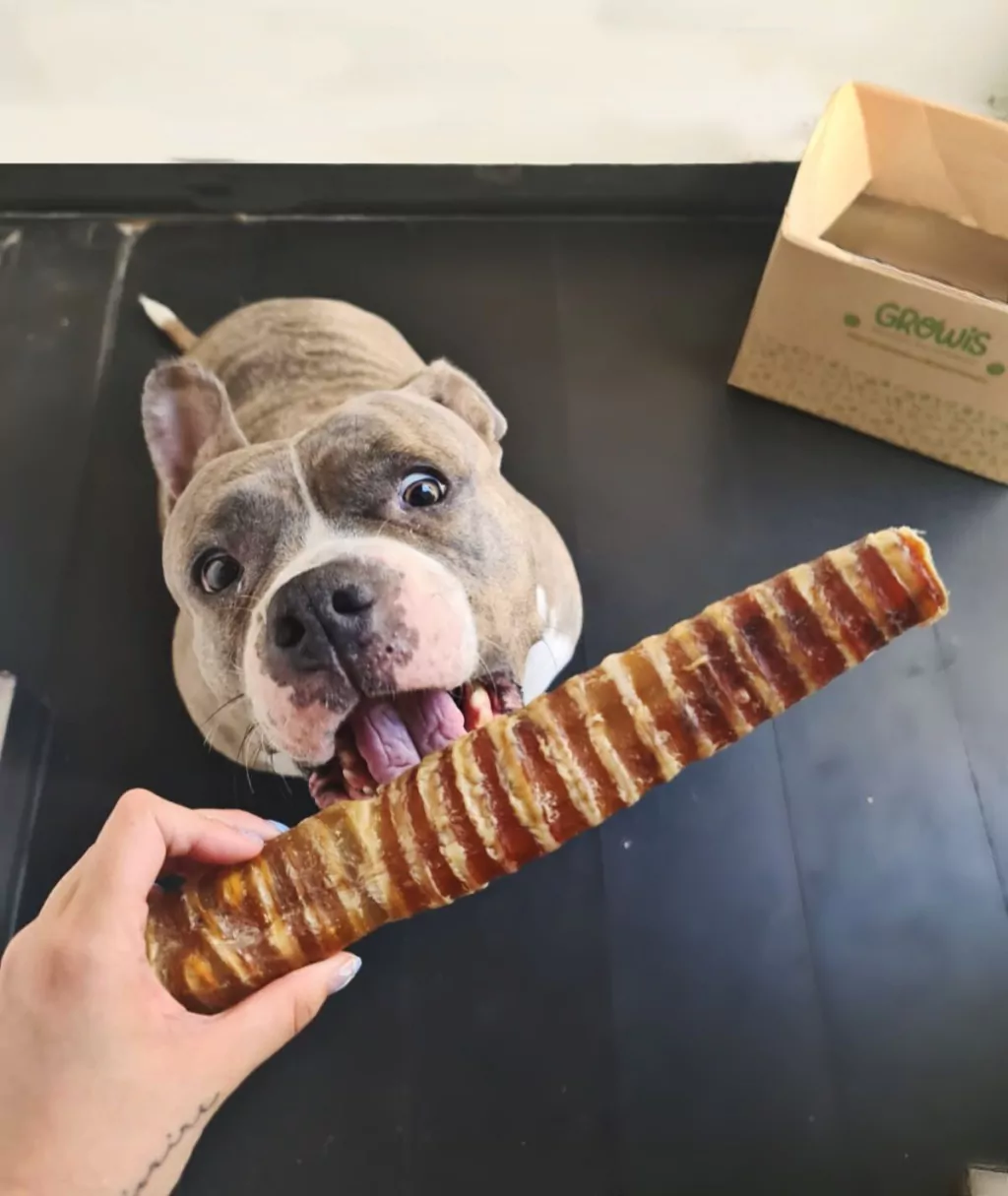 Traquea de 25 CM! Un premio nutritivo con DOBLE DESAFÍO. Además de ser una opción recomendada para ejercitar la masticación, podes brindarle una actividad recreativa a tu perriamigo... Rellená su interior con un rico queso untable + pollito y a disfrutar !Está compuesto por carne vacuna. Apto para perros medianos y grandes.💚Hechos con mucho amor, especialmente para mimar y premiar a tu perro amigo de una manera saludable!🐶Tip! Congela el snack con su relleno para que los disfrute durante más tiempo.Traquea bovina.🐾Presentación: 1 unidad termosellada. Peso unitario: 80 gr.No apto para consumo humano. Uso prohibido para la alimentación de vacunos, ovinos, caprinos u otros rumiantes. Uso exclusivo para alimentación animal a partir de los 3 meses de edad.