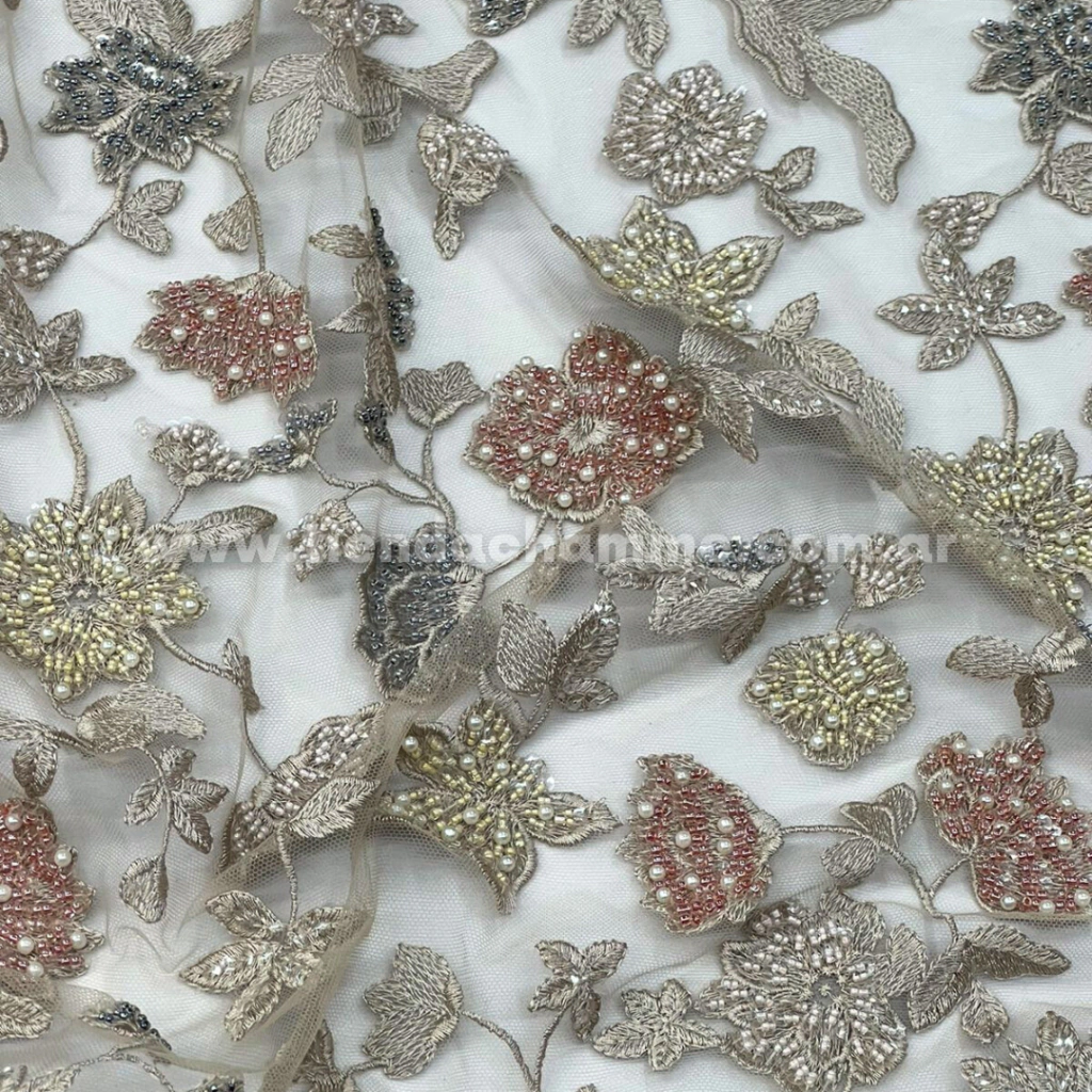 Tul beige, bordado con detalles de flores y canutillos de diferentes colores. Ideal para rcortes, customizar, o usarlo de manera completa.