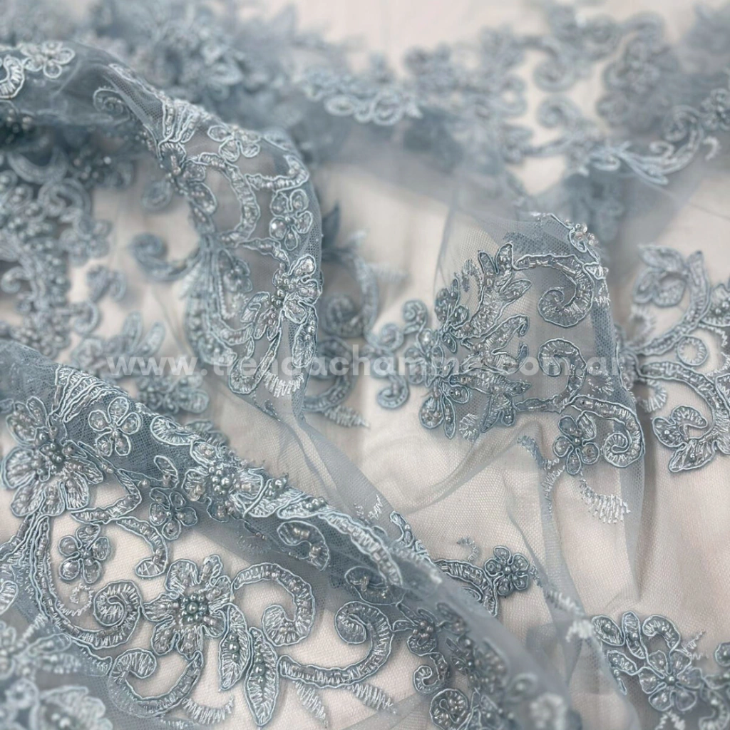 Tul bordado en rebrodee, con detalles de flores y guardas. Perlas bordadas a tono. Ideal para recortes o para usarlo de manera completa.