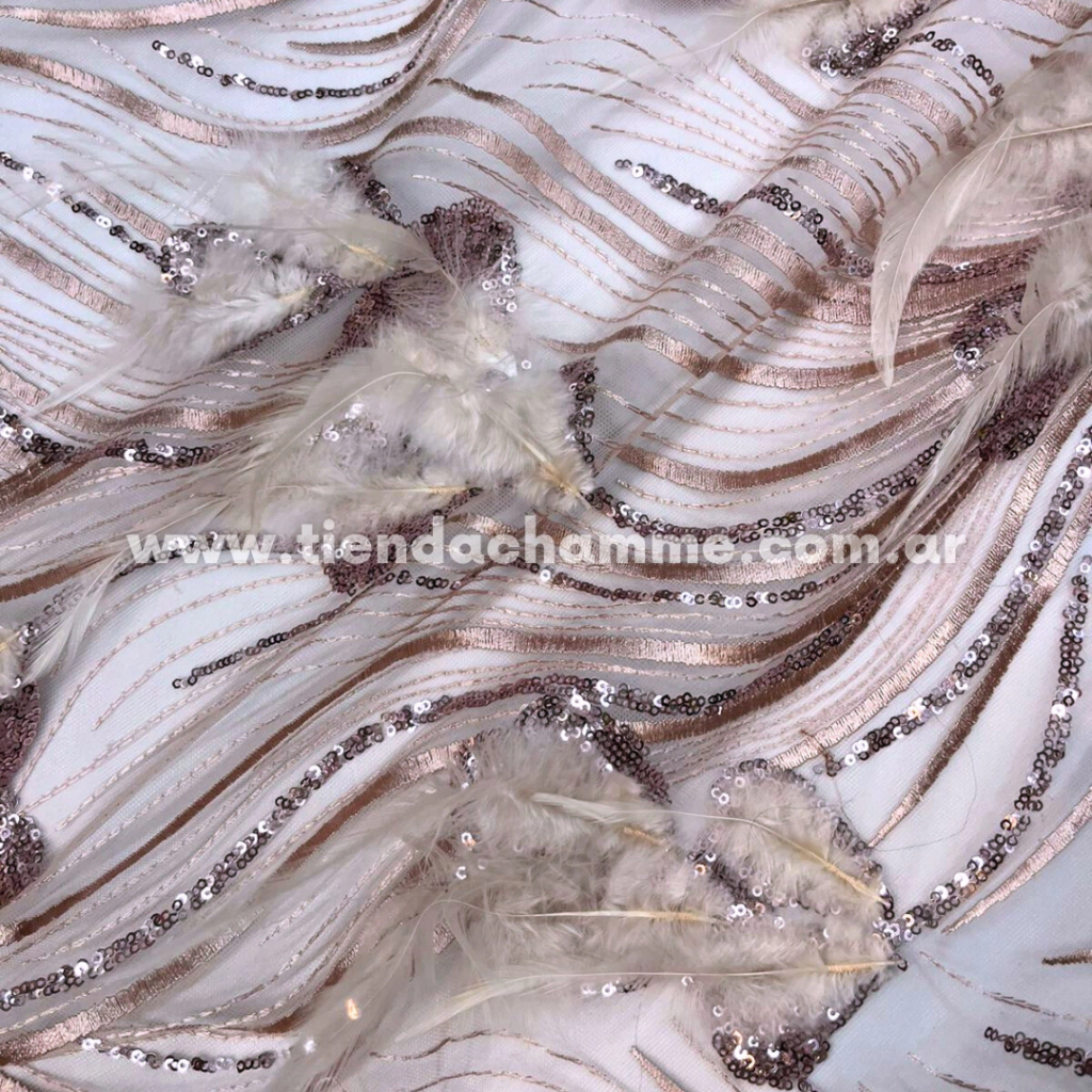 Tul bordado en tonos rosa viejo, con detalles de lentejuelas y pluMÁS bordadas. Ideal para usarlo completo o en recortes.