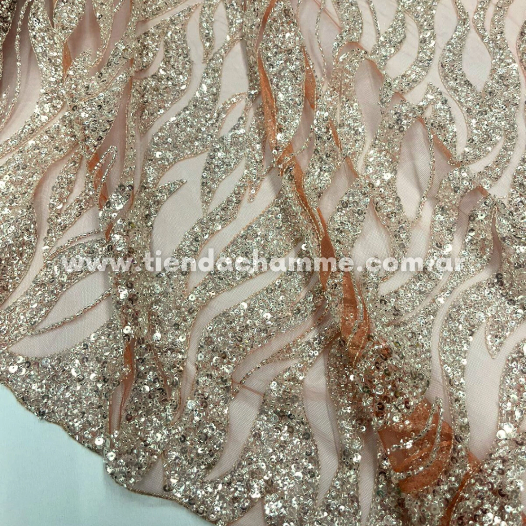 Tul rosado, bordado con pedreria plateada. Ideal para usarlo completo, o en recortes.
