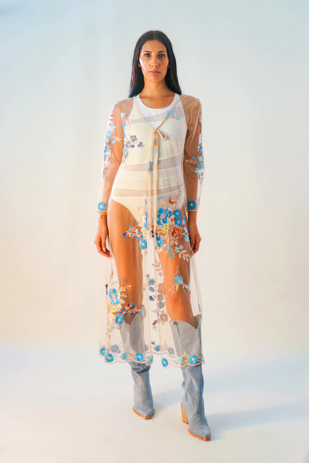 Disponible en nude con bordado en tonos turquesas y rojo, o en color hueso con bordado en tonos celestes y verdes.