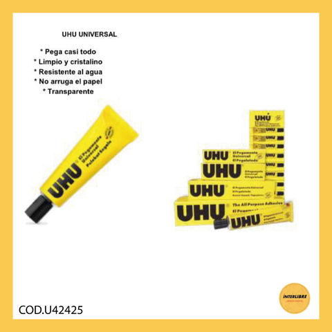 Uhu Universal x 20 ml.Líquido.Transparente.Secado rápido.No arruga el papel.Pega madera, materiales basados en madera, plásticos, metal, vidrio, porcelana, cerámica, cuero, goma, corcho, tela, cartón, papel, etc.