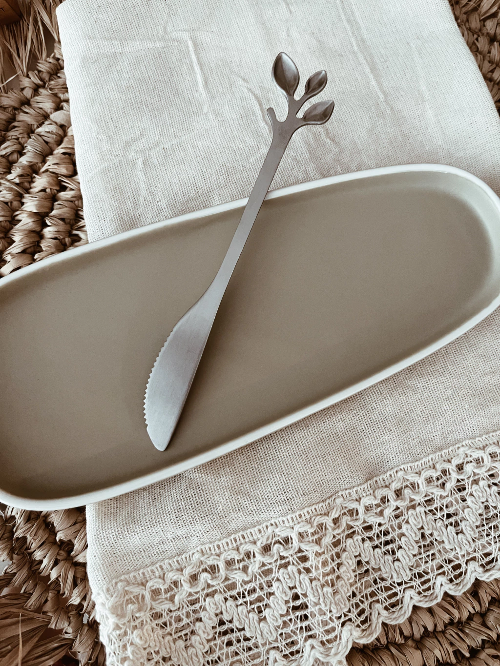 Set de 2 cuchillos untadores de acero inoxidable color plateado mate con diseño de hojasMedida: 15cm de largo