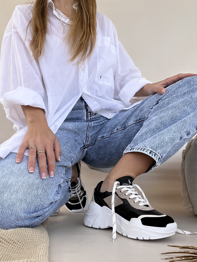 KALMA ESSENTIALS❤️Zapatillas de ecocuero negro y suela full expanso. Diseño urbano súper cómodas para diario😍Altura talón:5,6 cm (alta)Plataforma (adelante):2,9 cmHorma:Normal.Diseño:Detalles en ecogamuza beige y negra & ecocuero blanco.CUIDADOS:No rozar ni raspar para no dañar su material. Limpiar manualmente
