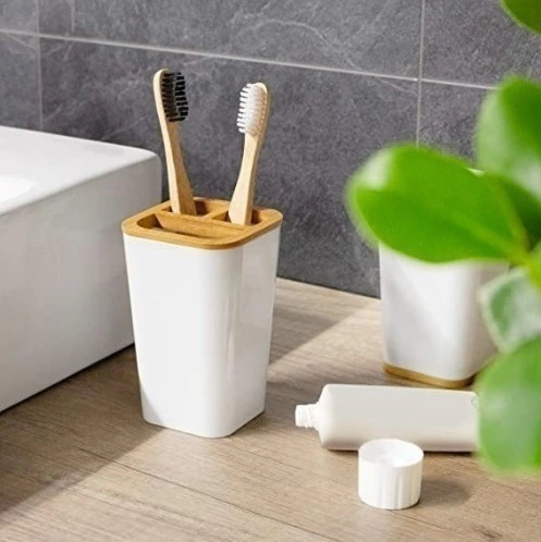 Vaso plástico blanco de PVC reforzado con detalles en madera bambú.Ideal para cepillo de dientes y pasta dental.Medidas: 11,5 x 7 x 7cm aprox