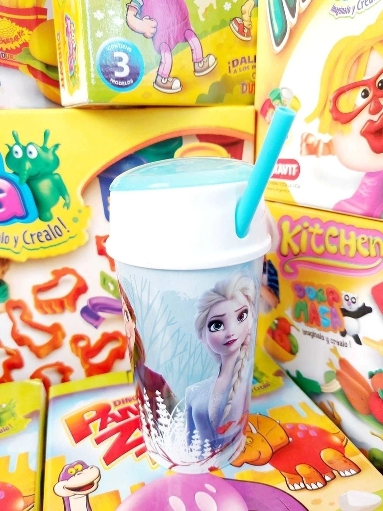 Vaso Frozen plástico con sorbete y tapa porta cereales ¡Este vaso trae un tapón con porta cereales y una pajita especialmente diseñada para que sea resistente a los derrames!