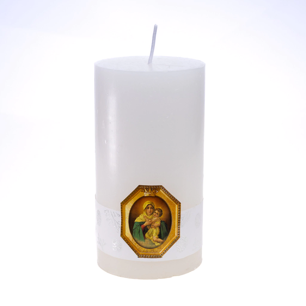 Velón blanco, aroma neutro, con imagen de la Virgen de Schoenstatt.Diemesiones: 7 cm de diámetro x 13 cm de alto.Color: BlancoDuración: 50 horas
