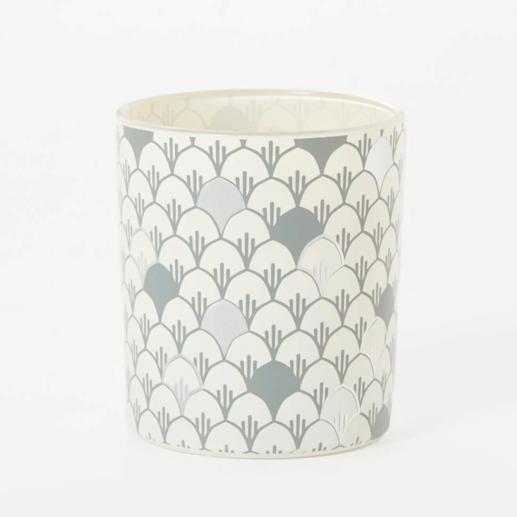 Vela cilíndrica de vidrio con diseño estampado. Fragancia: Higo