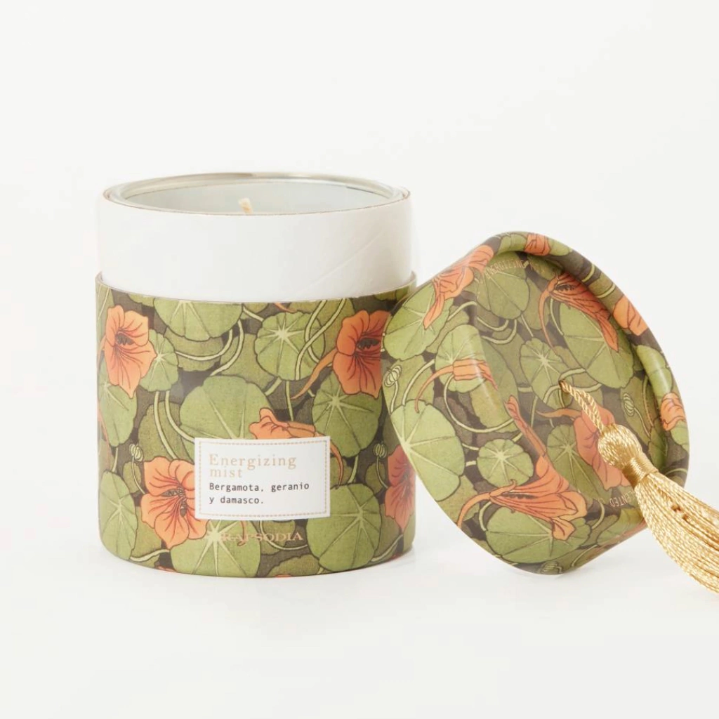 Vela de vidrio con diseño estampado en caja de carton con mismo diseño. Fragancia Energizing Mist (Bergamota, geranio y damasco).