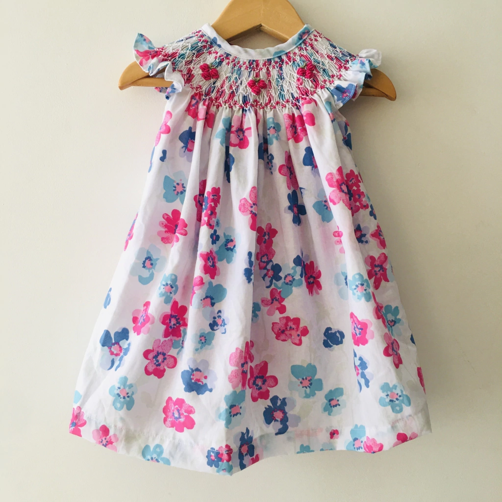 Vestido Carola100 % batista de algodónVestido confeccionado en batista estampada floral, ideal para primavera y veranoCanesu bordado a mano en punto smock.Cierre en espalda con 2 botonesSugerencia:El vestido lo podes acompañar con un saquito de hilo azul marino o blancoTe recomiendo siempre chequear las medidas de los productos ya que cada marca tiene su propia tabla de medidas y ademas una nena de 2 no tiene el mismo tamaño que otra nena de 2 años, asi es probable que una mas menudita use el talle 1 y otra mas alta y grande use el talle 4.Medidas:Talle 0-3 meses: largo total 38 cms / ancho de pecho 22 cms / sisa 8,5 cmsTalle 3-6 meses: Largo total 42 cms / ancho de pecho 24 cms / sisa 9 cmsTalle 6-12 meses: Largo total 50 cms / ancho de pecho 25 cms / sisa 10 cmsTalle 2 años: Largo total 57 cms / ancho de pecho 30 cms / sisa 11 cmsTalle 4 años: Largo total 62 cms / ancho pecho 35 cms / sisa 13 cmsLas medidas pueden variar levemente al ser una prenda de manufacturaRecomendaciones para un mejor lavado y planchado:- utilizar agua fria- lavar a mano del lado del reves- no planchar sobre el canesu- evitar el uso de blanqueadores
