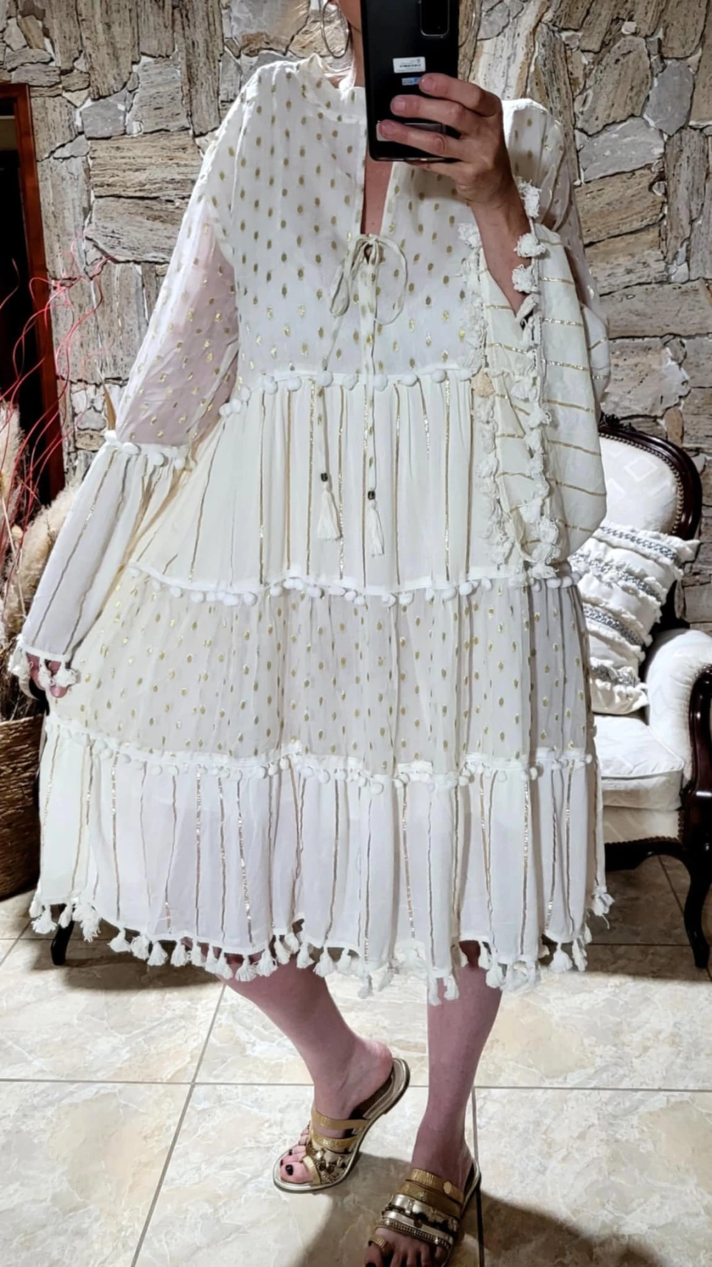 Vestido línea importada, al que también podés usar como camisola, confeccionado en bambula de lino premium en combinación con tul. Posee líneas en lúrex en color cobrizo y plata, más micro bordados sobre tul en color oro. Combinacipon exquisita... Posee mini borlas y mini pompones. Mangas mitad en Forrado en interior en lienzo suave, blando y muy cómodo. Tiene lazo para atar en alto busto. Cuerpo, estruxtura, caída y movilidad divinas.... Un modelo soñado.. Talle único que se adapta hasta un 2XL, aprox. Ver medidas que dejamos a continuación y comparalas con las de tu cuerpo.