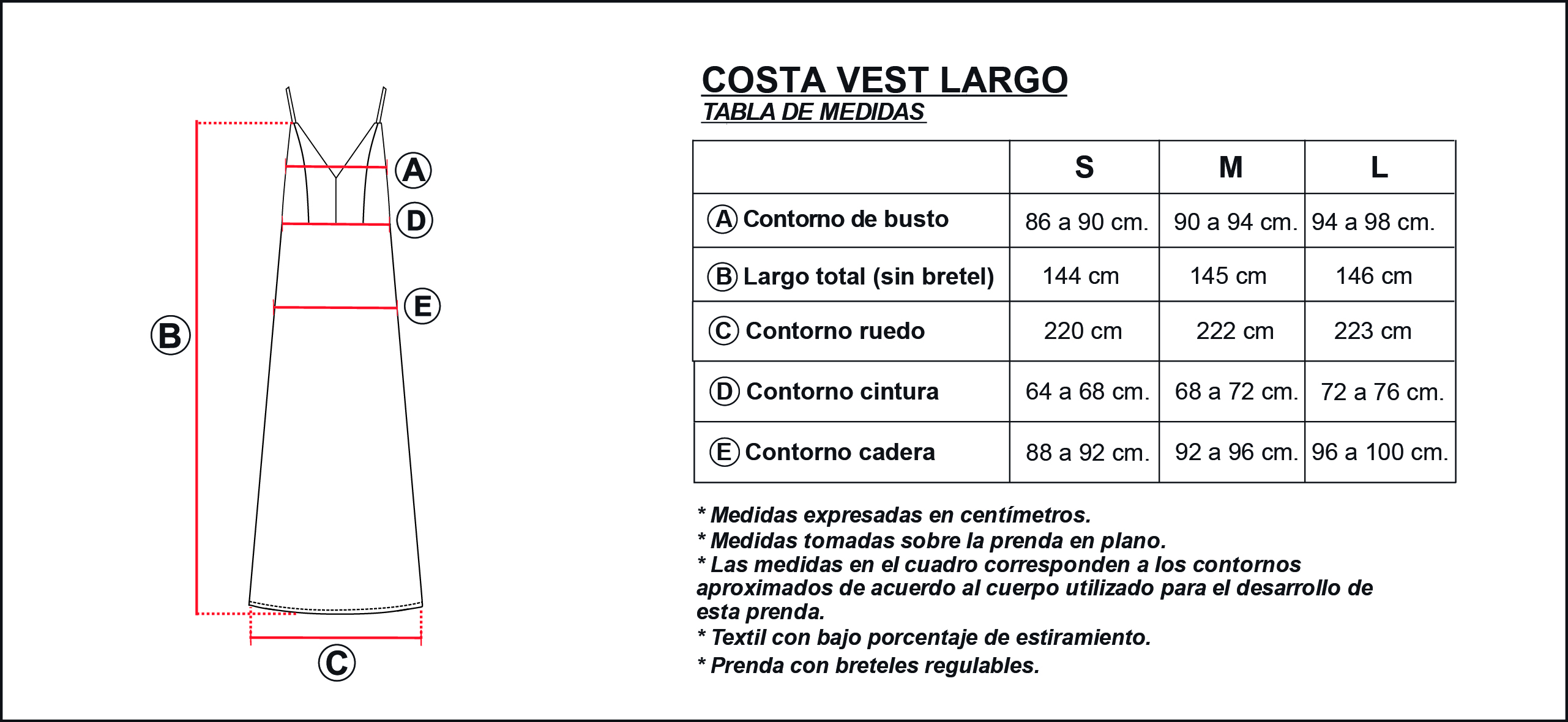 Vestido largo en satén de punto. Su escote delantero es en V y tiene dos tazas con recortes que entallan busto. La espalda tiene un escote profundo que culmina en un nudo a la altura de la cadera. Tiene breteles finos con reguladores. Se encuentra íntegramente forrado.