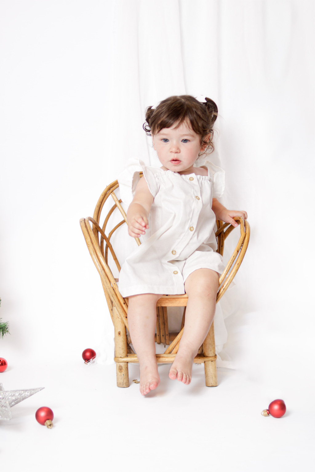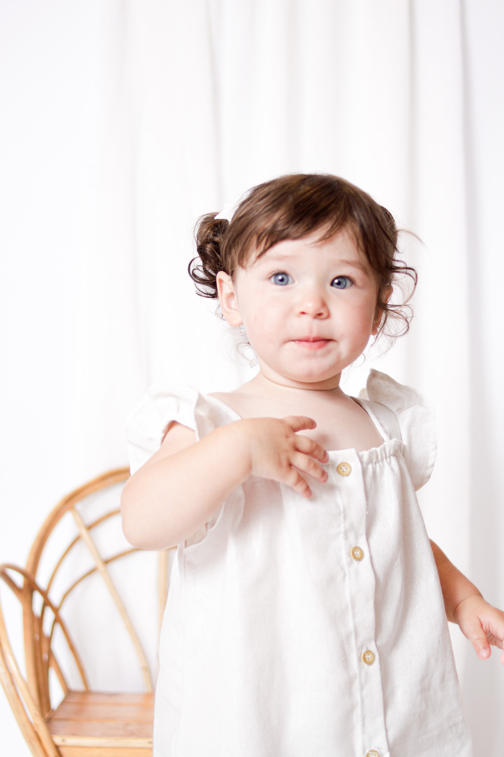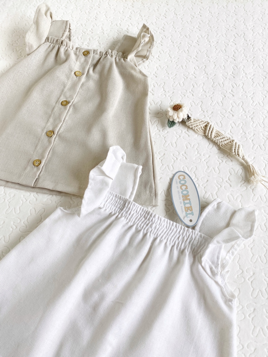 Vestido sin mangasen lino liso.-Con volados en los hombros y botones de madera para acceder a la prenda.Talles:6/9/12/18 y 24 meses.HECHO CON DULZURA Y AMOR..
