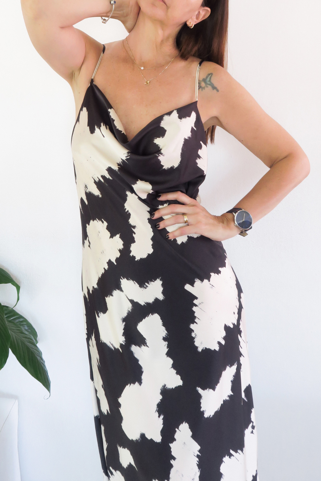 Vestido de satén estampado, con detalle de escote buche, super femenino y elegante. Tiene tiras para ajustar en la espalda. Doble en la parte del busto.