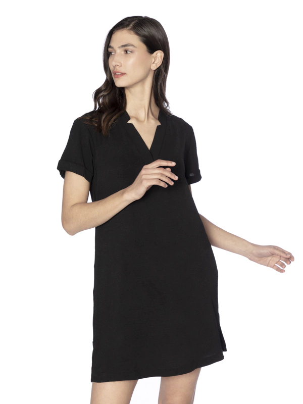 Este vestido de sastrería ultraliviano se destaca por su calce amplio y su longitud que llega justo por encima de la rodilla, ofreciendo una mezcla perfecta de comodidad y estilo. El escote en V presenta pequeñas aberturas que añaden un toque de modernidad, mientras que las mangas cortas con terminación roll-up aportan un aire casual y desenfadado. En la parte trasera, el vestido cuenta con un canesú con fuelle que brinda mayor libertad de movimiento, y los tajos laterales en la zona del ruedo le otorgan un detalle distintivo y funcional, ideal para un look relajado pero elegante.Tejido: Sastrero ultraliviano.Composición: 100% Polyester.Cuidados Especiales: *Lavar en agua fría *Lavar a mano *Secar a la sombra *Plancha tibia del revés.