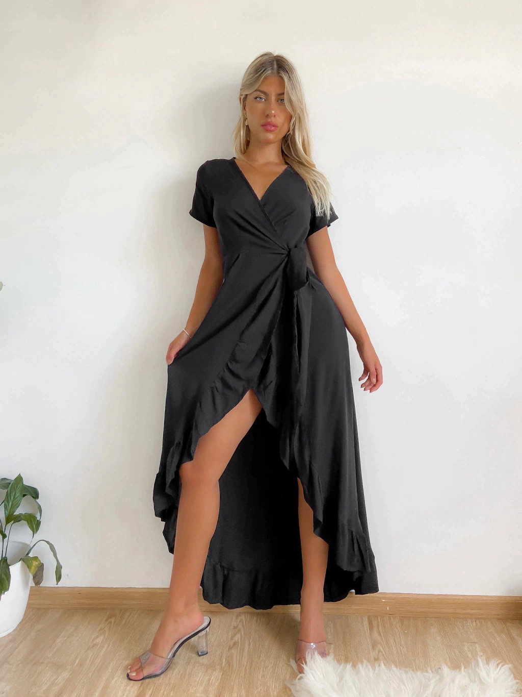 Vestido de largo irregular (atras mas largo), manga corta, con volado en ruedo, de fibrana, cruzado.