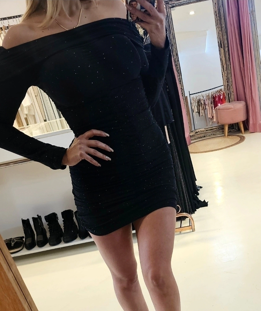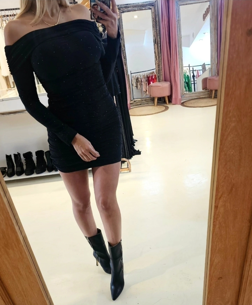 Vestido Galaxia glitter drapeado cuello volcado manga larga. Elastizado!