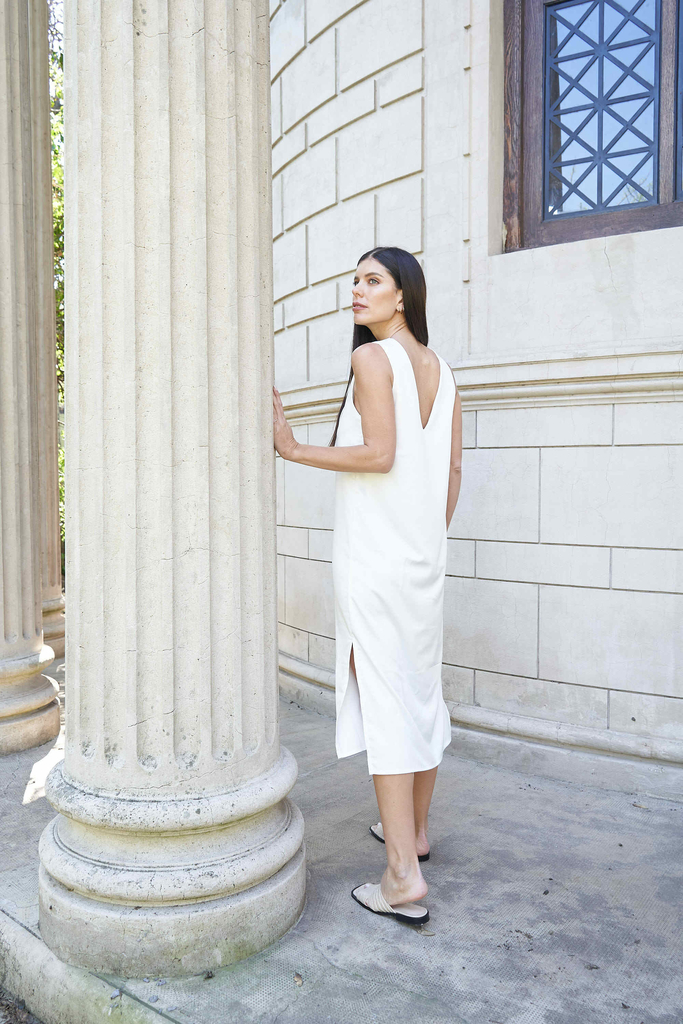 Descripción:Vestido HELENA midi, escote delantero y trasero en V vista interna sin mangas. De ambos lados presenta tajos laterales. Confeccionado en seda premium con caída y de corte amplio. Combina este vestido con un saco MANHATTAN para un look de noche.Colores:Negro Off white NaranjaTalles Disponibles:S/1 M/2 L/3Guía de talles (*)TalleS: Busto 92 - Largo 120 - Sisa 48TalleM: Busto 96 - Largo 122 - Sisa 52TalleL: Busto 100 - Largo 123 - Sisa 56(*) Talles aproximados a medidas realesCuidados: Lavar a mano en agua fría con jabón para prendas delicadas. No utilizar suavizantes.Secar la prenda en plano y a la sombra, no retorcer. Planchar a baja temperatura y del revés. Guardar las prendas limpias, en lugares frescos y secos, al resguardo de la luz solar. No utilizar limpiadores abrasivos, detergentes, alcoholes, amoníaco o cloro que pueden dañar las fibras. Para manchas específicas, limpia la zona afectada con detergentes suaves, no frotar enérgicamente. Evitar roces que puedan dañar la prenda, cadenas, hebillas, velcros, etc.