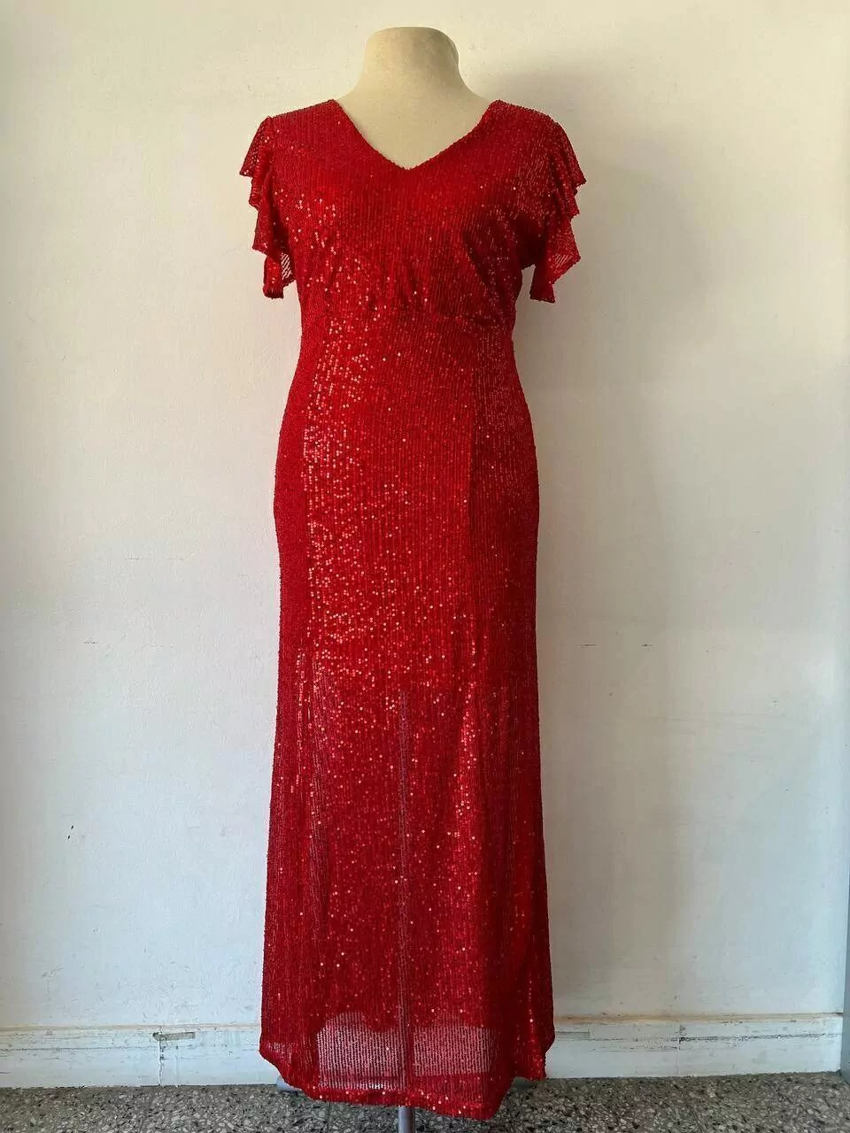 Vestido lArgo de lentejuelas, mangas japonesas, con tajo en falda.