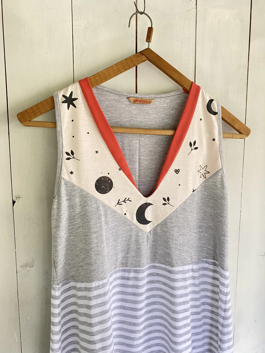 Prenda de jersey de algodón con delanteroestampado de lunas y estrellas.Talle S: Ancho sisa 40 cm / cintura 50 cm / largo 117 cmTalle M: Ancho sisa 41 cm / cintura 51 cm / largo 118 cmTalle L: Ancho sisa 42 cm / cintura 52 cm / largo 119 cm