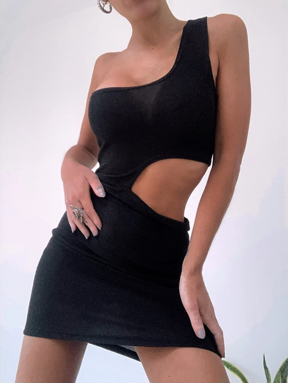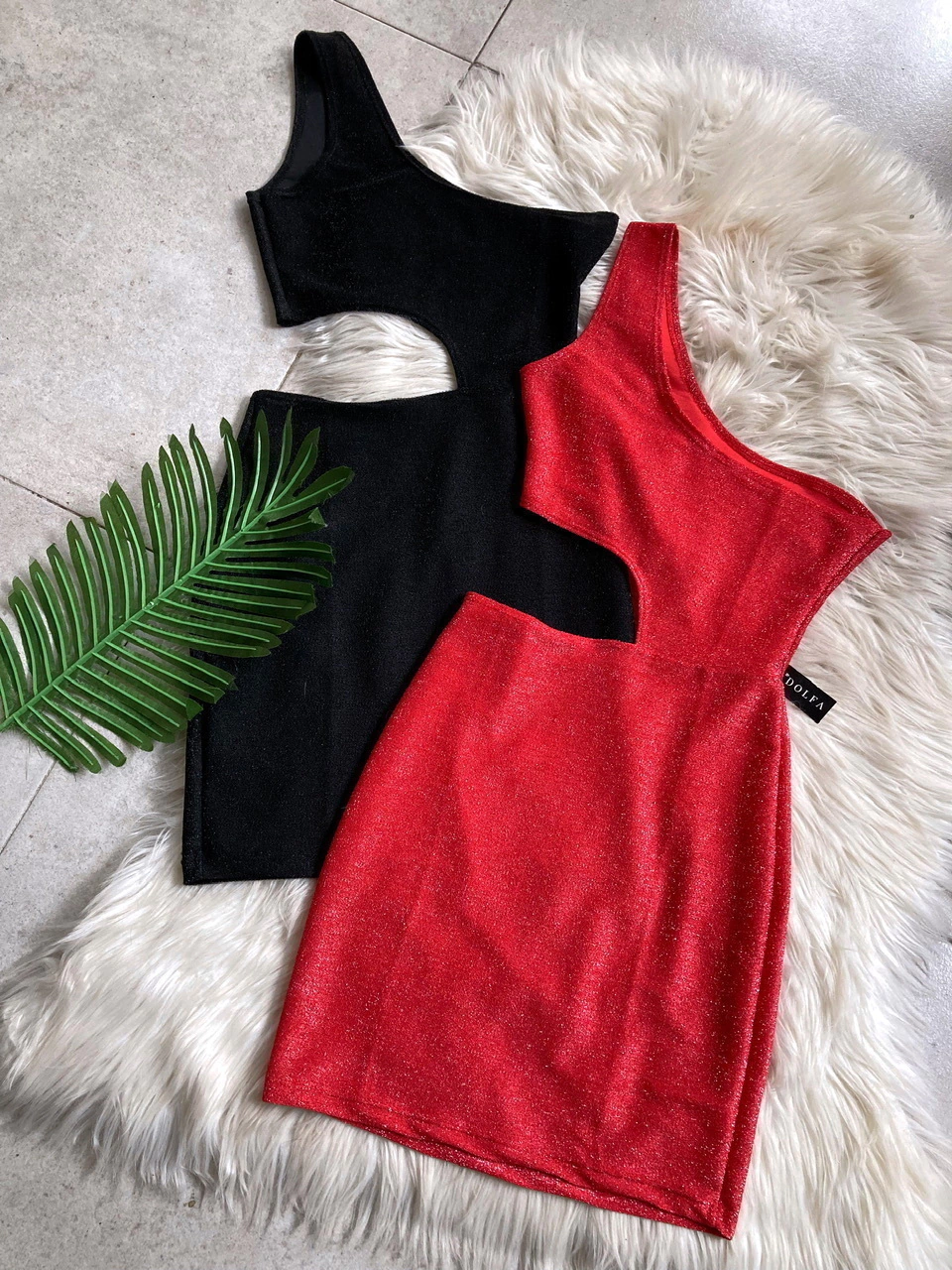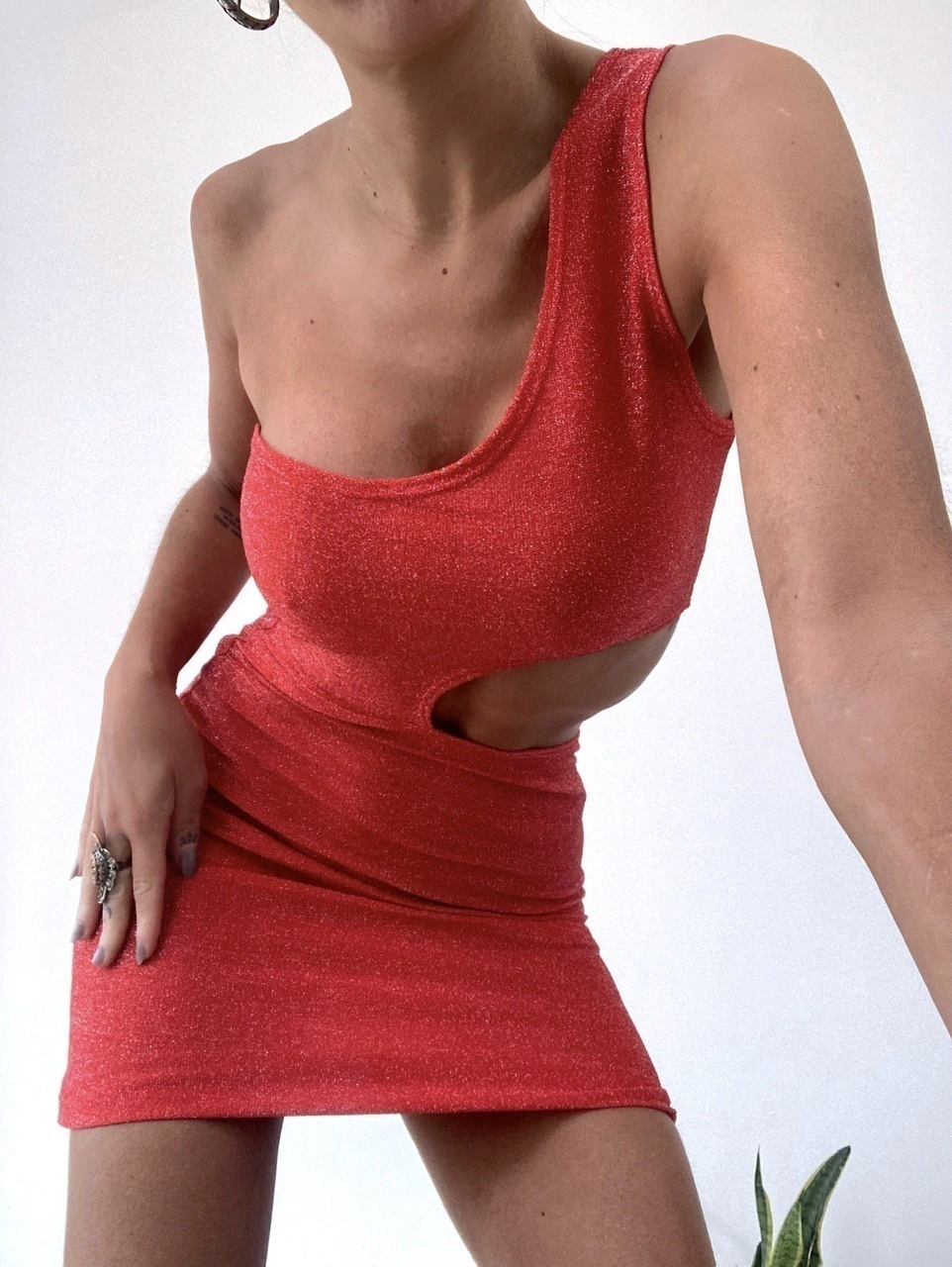 Vestido de lurex con un solo hombro y abertura a un lado. Modelo al cuerpo, talle único S. Color fucsia, negro, plata, rojo o blanco.