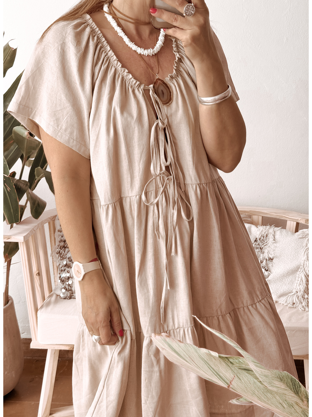 Vestido de lino con manguitas y volados, cuello redondo elastizado con lazo .ideal para usar todo el verano y sentirte fresca y hermosasTalle UnicoImportante :este tipo de tela debe lavarse a mano con agua fría , no centrifugar y secar a la sombra