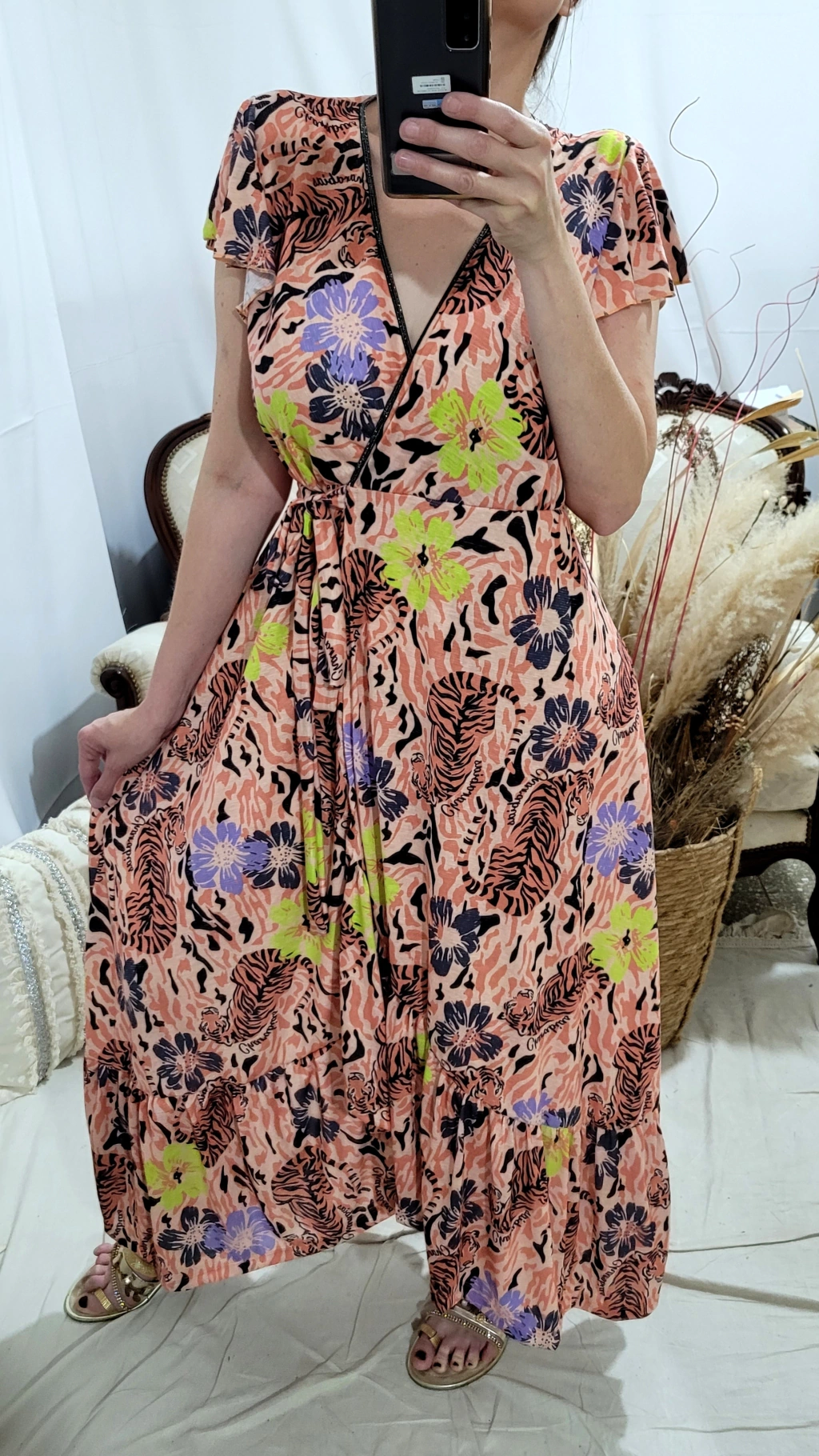Vestido AMPLIO, cruzado, con bolsillos laterales y lazo ajustable / regulable. Posee volados en todo el ruedo y en mangas ( bien amplias y caídas ) Cuello en V, con vivo en color negro y mini glitters en color plata. Tiene lazo cocido ( se pasa por dentro una parte por una apertura con la que cuenta en el lateral superior derecho, y con la otra parte que queda de al lado de afuera, lo unís y atás ) Está confeccionado en flamé súper liviano con spandex ( elastizado ) Tiene bastante tela, por lo cual ésta característica sumada a que es un modelo regulable, se adapta perfecto a diferentes y varios talles, porque los vas cerrando y/o abriendo, regulando, y así, adaptándolo a tu cuerpo. Talle ÚNICO AMPLIO / REGULABLE, que se adapta aproximadamente a partir de un talle M, y/hasta un 4XL, aprox. Ver medidas que dejamos a continuación.