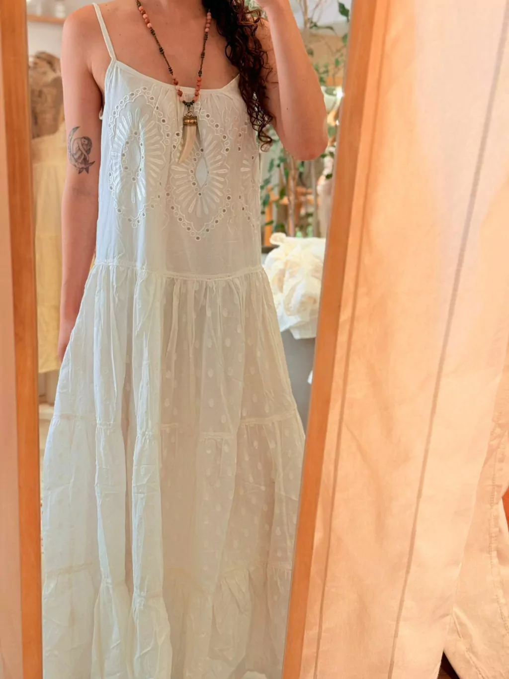 Vestido blanco largo, bordado con tiritas para regular.Acordate que tenemos 15% de descuento pagando por transferencia (en compras online) y 15% de descuento contado efectivo (en el local o si elegis con Nico cadete), tambien trabajamos con 3 pagos sin interes con visa/master de bancos.Medidas (se toman con la prenda sobre la mesa, no es el contorno)Talle UBusto: 43cm.Cintura: 47cm.Cadera: 49cm.Largo prenda: 138cm.Sisa: 23cm.