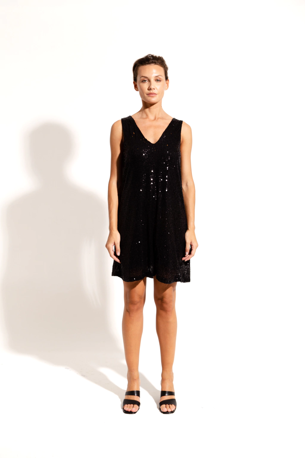 Descripción: Vestido MOON mini, escote en V por delante y por detrás, sin mangas. Totalmente forrado con voile al tono. Confeccionado en paillette de corte amplio y con caída. Animate a combinarlo con el saco KYOTO lucirá increíble para un look noche.Colores:Negro NudeDisponibles: S/1 M/2Guia de Talles(*)Talle:S: Busto 94 cm - Cadera 96 cm - Largo Total 90 cmTalle:M: Busto 94 cm - Cadera 100 cm - Largo Total 92 cm(*) Talles aproximados a medidas realesCuidados: Lavar a mano con jabón neutro; agua fría; no usar secadora; lavar del revés;no usar blanqueadores; secar en plano; guardar del revés. NO PLANCHAR. Se sugiere limpieza profesional.