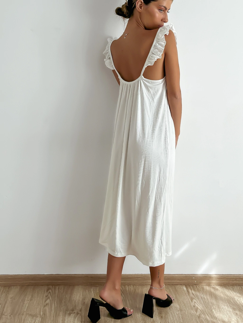 Vestido morley viscosa volados en escote y bretel, espalda cavadaEscote: AmplioLongitud: MidiTipo de ajuste: AmplioTejido: , Elastiza hasta un 35% más que las medidas publicadasMaterial: Morley viscosaComposición: 97% rayón, 3% spandexInstrucciones de Cuidado: Lavar a mano con agua fría y jabón suave. No retorcer. No centrifugar. Planchar a baja temperaturaDetalles: Volado en escote y breteles finos, espalda cavadaMedidas: Las medidas son aproximadas, pueden variar algunos cms.TALLE ÚNICOMEDIDAS: ANCHO DE SISA A SISA: 51CM / LARGO: 124,5CMMEDIDAS DE LA MODELOMartuContorno de busto: 82 cmContorno de cintura: 59 cmContorno de cadera: 88 cmAltura: 1,65 mts