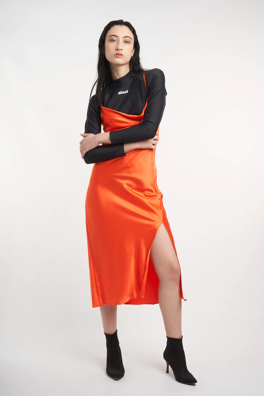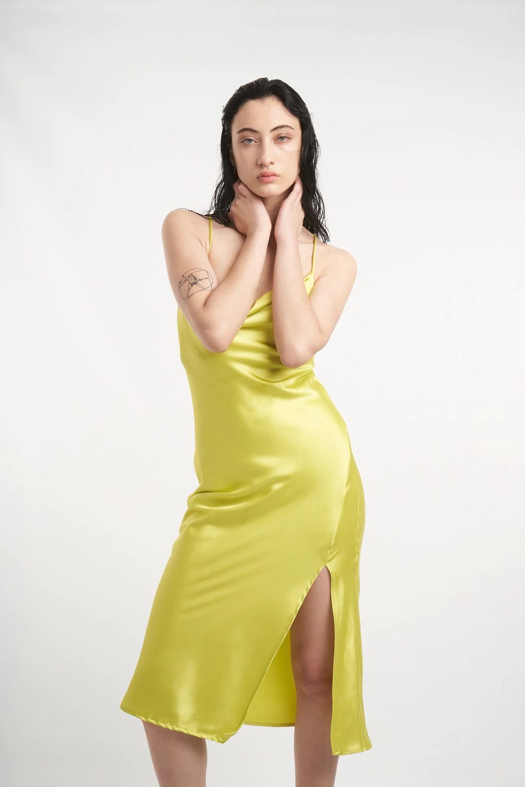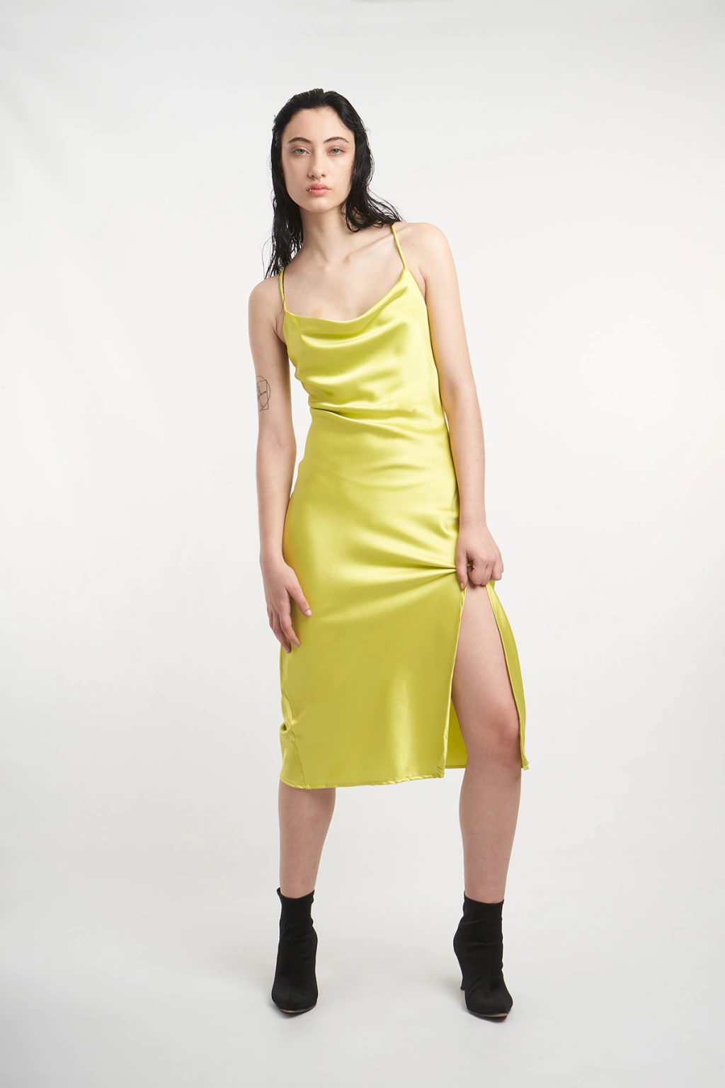 DescripciónVestido de seda.Con tiras finas posteriores para regular la caída.Espalda cruzada. Tajo lateral.Largo hasta debajo de las rodillas.Ideal para todas las estaciones.