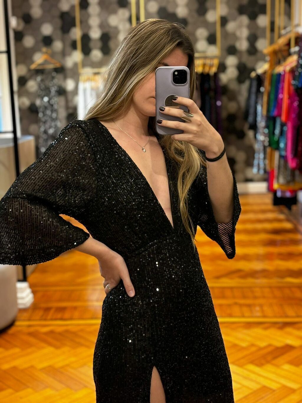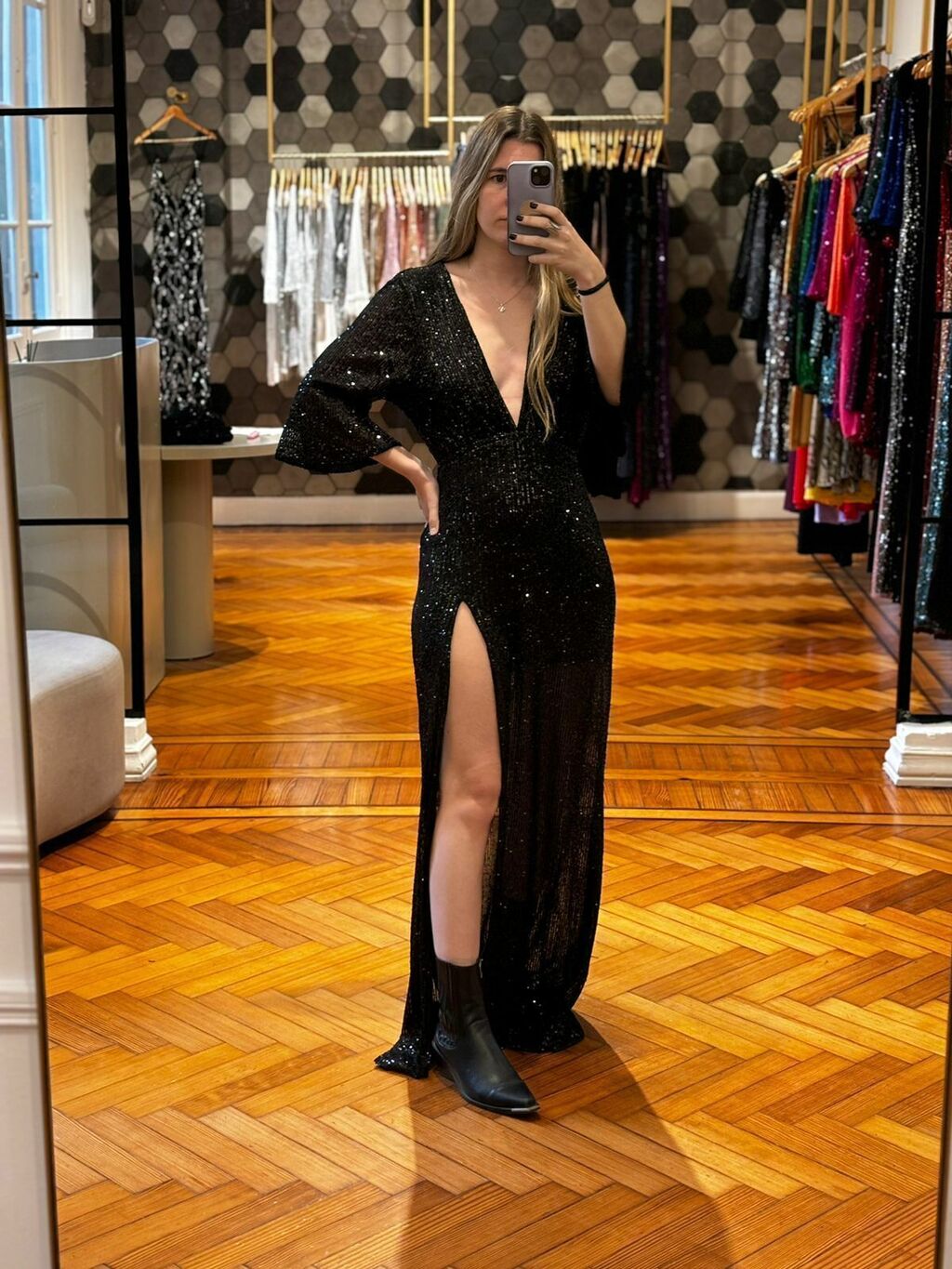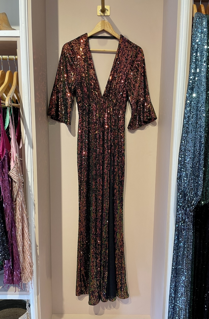 Vestido de paillettes escote en v forrado en seda fría con elástico en cintura y mangas 3/4 con volados, posee tajo delantero.MEDIDAS:Talle STalle MTalle LContorno de busto88 cm92 cm96 cmContorno de cintura (sin estirar)62 cm66 cm70 cmContorno de cintura (estirado)72 cm76 cm80 cmContorno de cadera98 cm102 cm106 cmLargo escote35 cm35 cm35 cmlargo manga43 cm44 cm45 cmlargo prenda158 cm160 cm162 cm* Las medidas son tomadas de la prenda* Las medidas pueden variar unos centimetrosCuidados:- Lavar con agua fría a mano, no refregar.- No dejar en remojo ni utilizar limpiadores concentrados ni blanqueador.- Secar extendido.