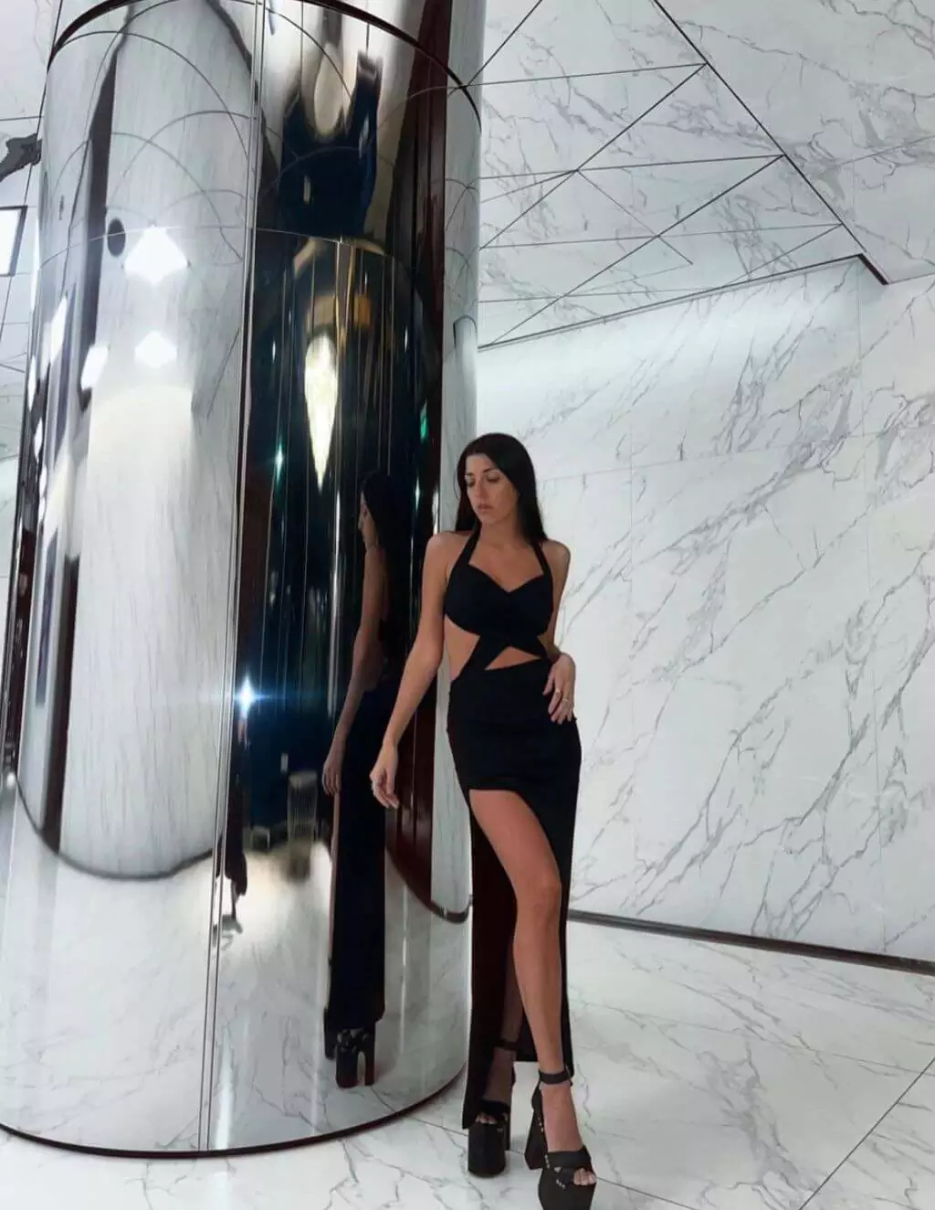 Vestido tipo crepe elastizado con busto cruzado atado al cuello con tajo lateral.