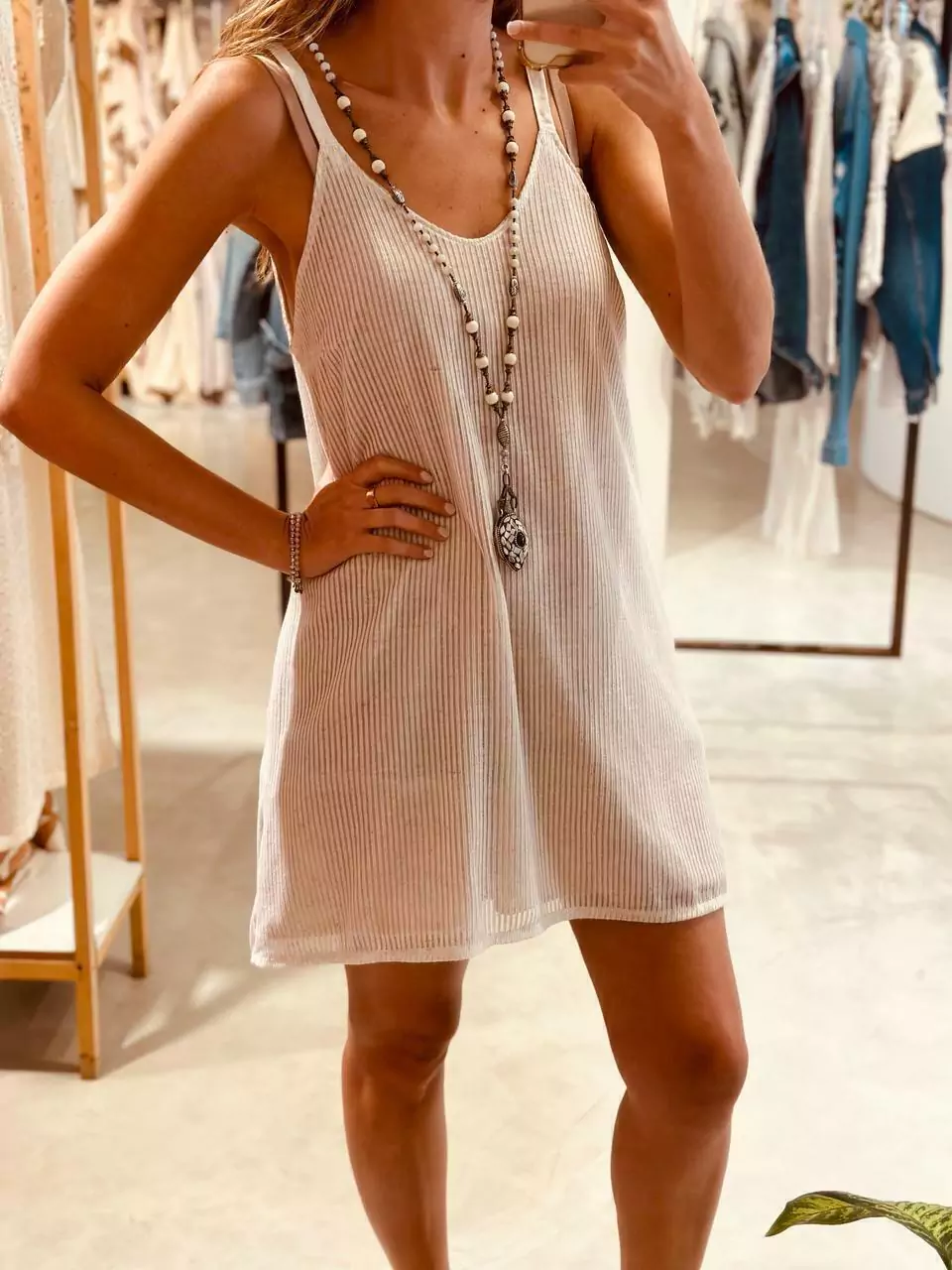 Vestido corto musculosa de morley transparente, color crudo forrado por dentro.
