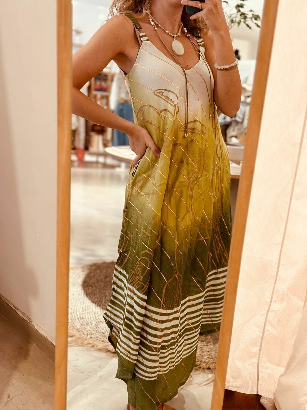 Vestido degrade entre blanco a verde lineas medio que horizontales dorados estampa abajo dorada.Acordate que tenemos 15% de descuento pagando por transferencia (en compras online) y 15% de descuento contado efectivo (en el local o si elegis con Nico cadete), tambien trabajamos con 3 pagos sin interes con visa/master de bancos.Medidas (se toman con la prenda sobre la mesa, no es el contorno)Talle UHombros: 27cmBusto: 49cm.Cintura: 54cmCadera: 76cm.Largo prenda: 114cm.Sisa: 23cm.