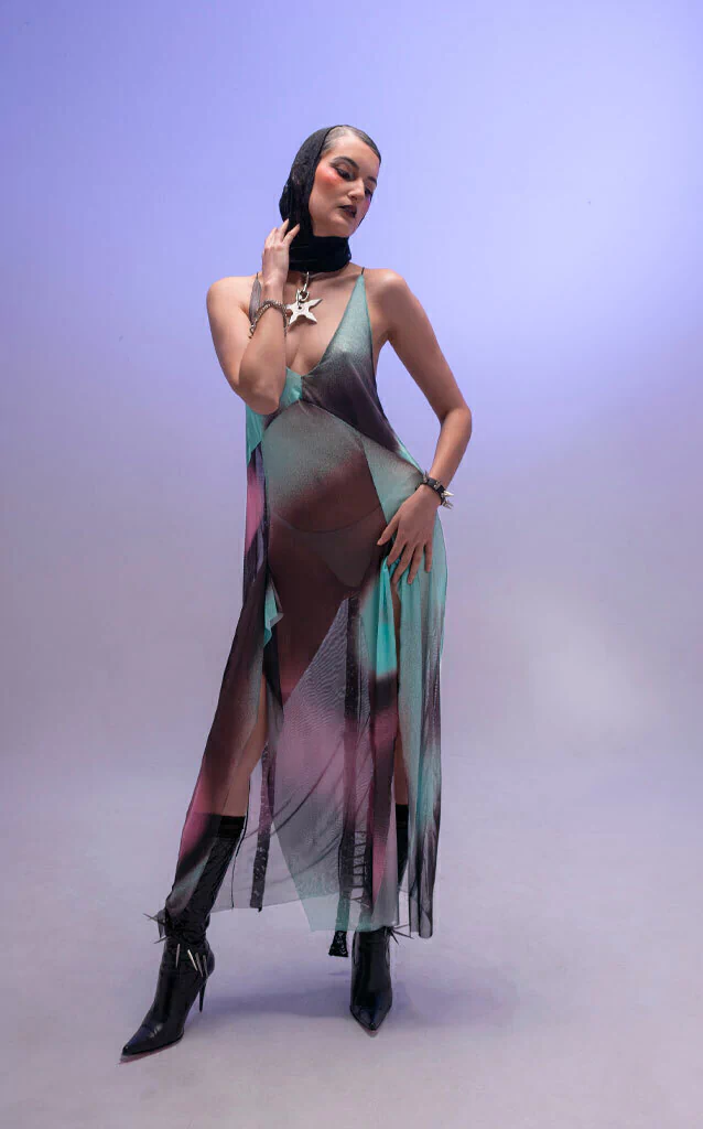Vestido de microtul elastizado doble rebote, con tirante y una caida espectacular. Tiene dos tajos adelante.
